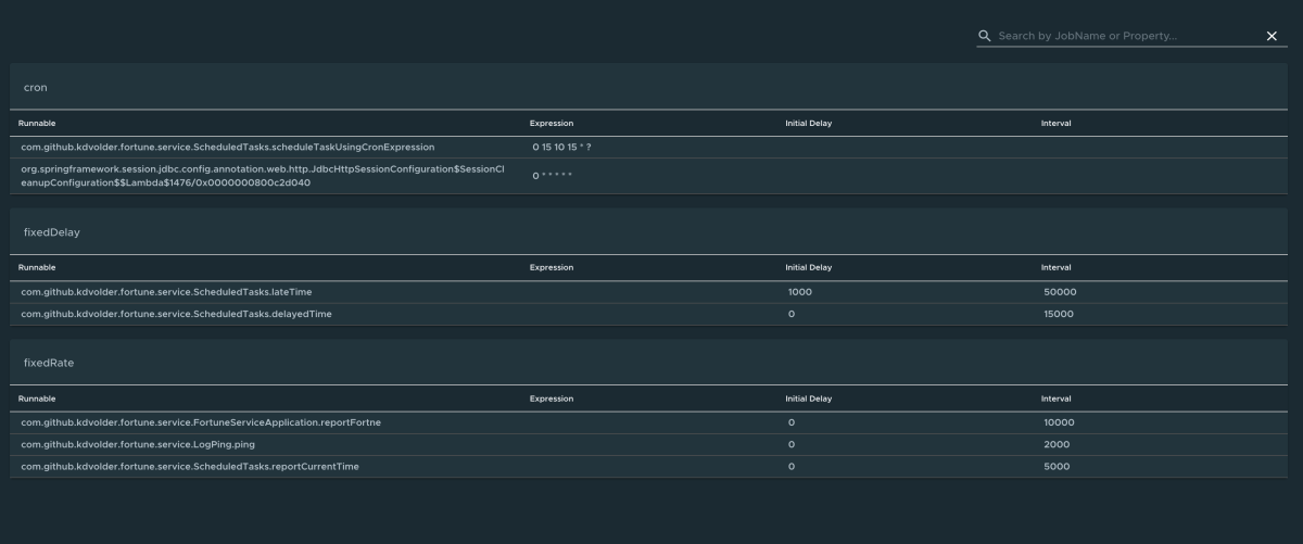 Per passare alla pagina Attività pianificate, selezionare l'opzione Attività pianificate dall'elenco a discesa Categoria informazioni. La pagina Attività pianificate fornisce informazioni sulle attività pianificate dell'app, tra cui attività cron, attività a ritardo fisso e attività a frequenza fissa, attività personalizzate e proprietà associate.