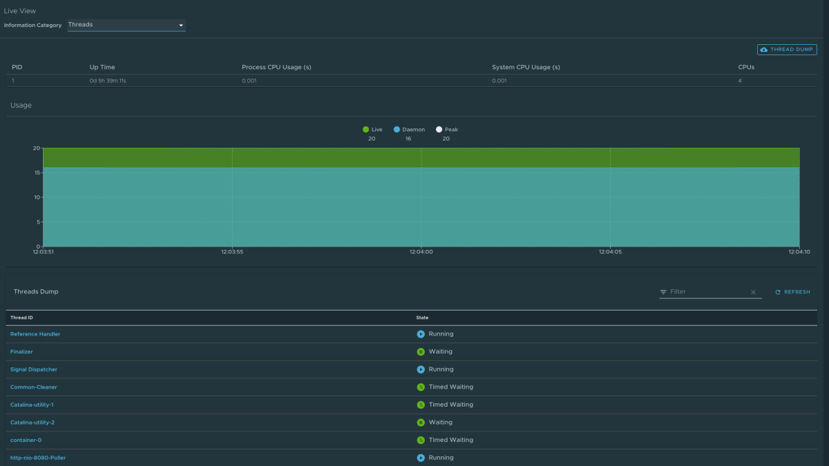 Per passare alla pagina Thread , selezionare l'opzione Thread dall'elenco a discesa Categoria informazioni. Questa pagina visualizza tutti i dettagli relativi ai thread JVM e ai processi in esecuzione dell'app. Questo tiene traccia dei thread live e dei thread daemon in tempo reale. Si tratta di uno snapshot di stati di thread diversi.