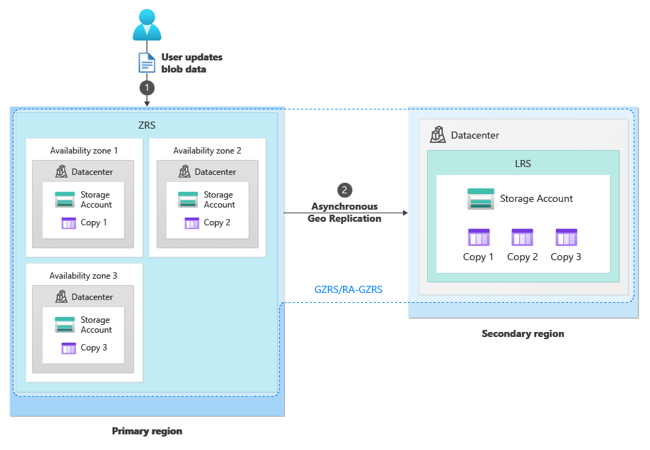 In circostanze normali, un client scrive i dati in un account di archiviazione nell'area primaria tramite gli endpoint del servizio di archiviazione (1). I dati vengono quindi copiati in modo asincrono dall'area primaria all'area secondaria (2). L'immagine seguente mostra lo stato tipico di un account di archiviazione configurato come GRS.