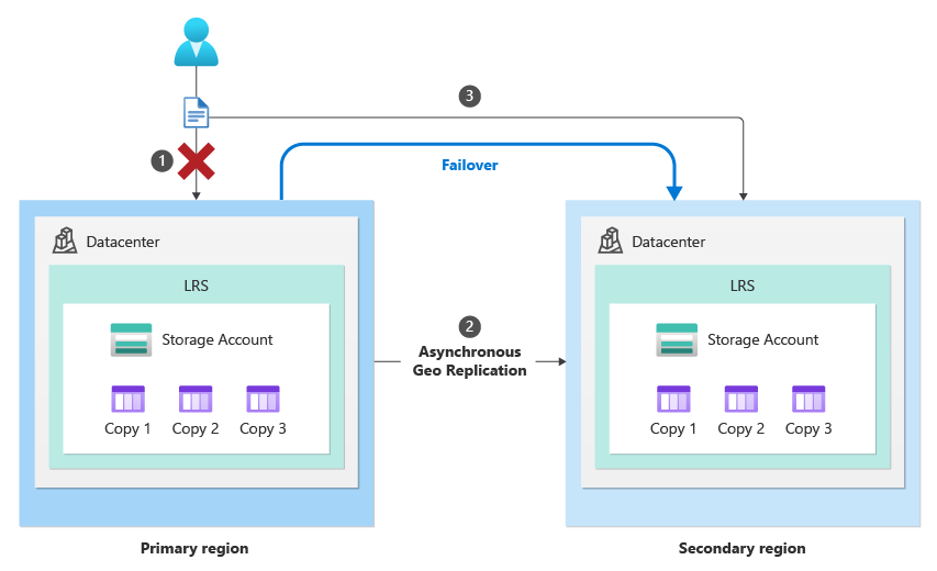 Durante il processo di failover pianificato, gli endpoint del servizio di archiviazione dell'area primaria diventano di sola lettura, mentre gli aggiornamenti rimanenti terminano la replica nell'area secondaria. Successivamente, tutte le voci DNS (Servizio dei Nomi di Dominio) dell'endpoint del servizio di archiviazione vengono cambiate. Gli endpoint secondari dell'account di archiviazione diventano i nuovi endpoint primari e gli endpoint primari originali diventano i nuovi endpoint secondari. La replica dei dati all'interno di ogni area rimane invariata anche se le aree primarie e secondarie sono cambiate.