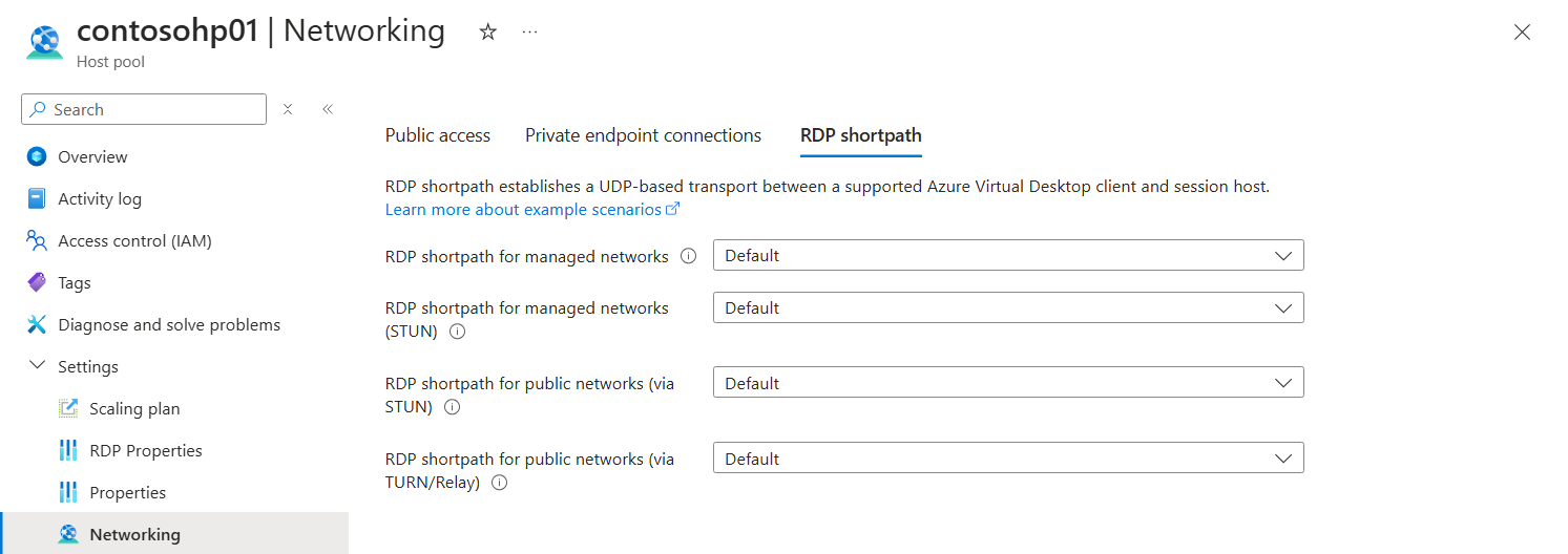 È possibile controllare in modo granulare come viene usato il percorso breve RDP configurando le impostazioni di rete di un pool di host usando il portale di Azure o Azure PowerShell. La configurazione di RDP Shortpath nel pool di host consente di impostare facoltativamente quale delle quattro opzioni di Percorso breve RDP si vuole usare e viene usata insieme alla configurazione dell'host sessione.