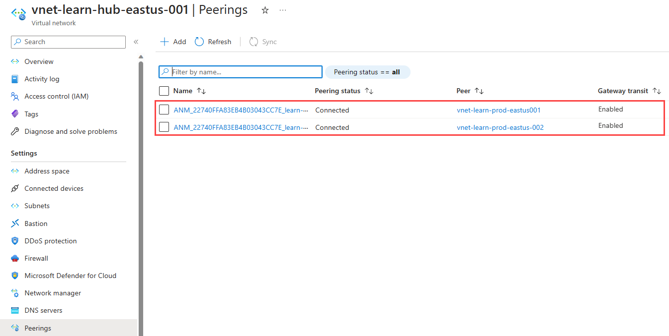 Passare a vnet-learn-hub-eastus-001 e selezionare Peerings in Impostazioni per elencare i collegamenti di rete virtuale creati da Azure Network Manager. Il nome inizia con ANM_.