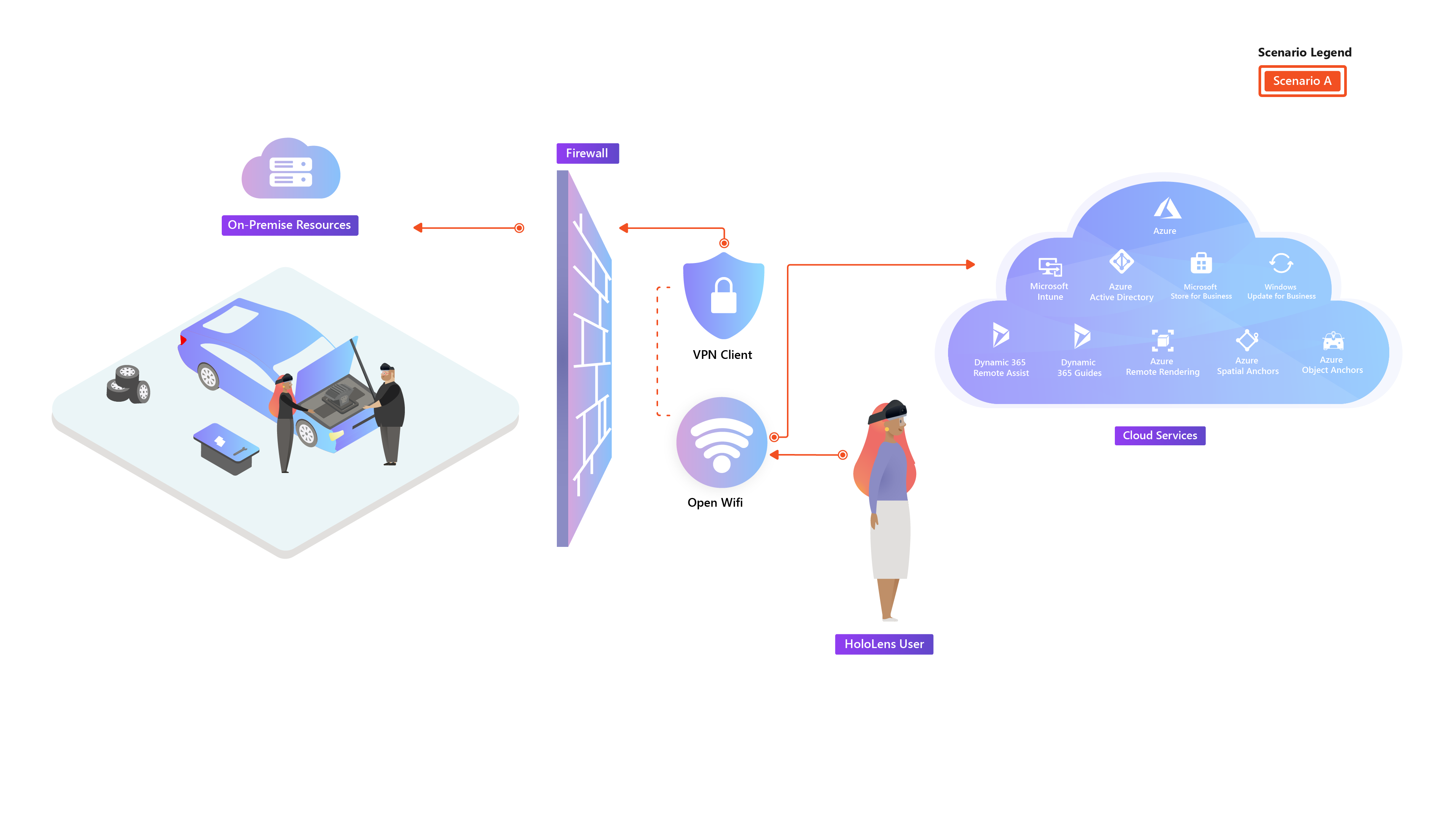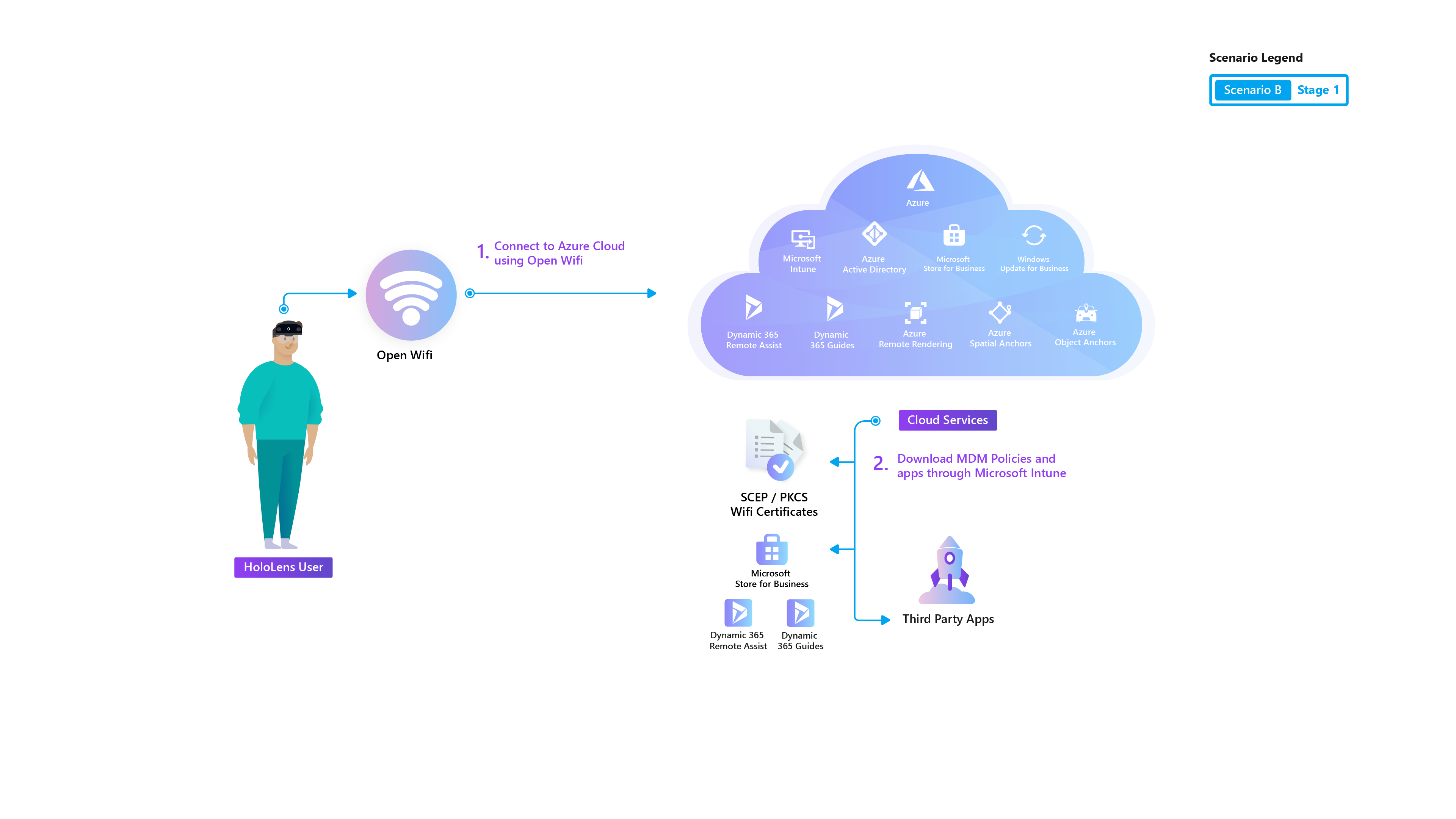 Questo scenario è paragonabile alla distribuzione di dispositivi mobili gestiti all'interno di un'azienda. HoloLens 2 viene distribuito per l'uso principalmente in ambienti esterni a una rete aziendale. Le risorse aziendali non sono accessibili o possono essere limitate tramite VPN.