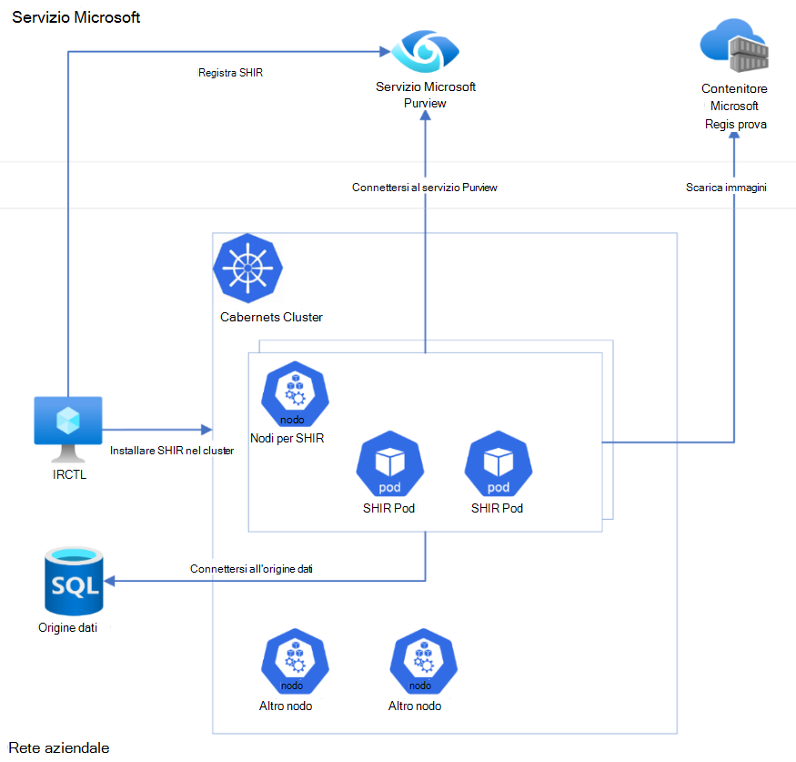 In una visualizzazione architetturale generale, quando viene installato un file SHIR basato su Kubernetes, diversi pod vengono creati automaticamente nei nodi del cluster Kubernetes degli utenti. Questa installazione può essere attivata da uno strumento da riga di comando denominato IRCTL (più in dettaglio nelle sezioni seguenti). IRCTL si connette al servizio Microsoft Purview per registrare SHIR e connettersi al cluster Kubernetes per installare SHIR.