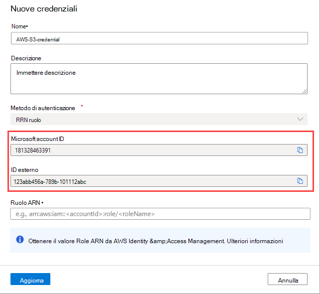 - Quando si aggiungono i bucket come risorse di Microsoft Purview, sono necessari i valori di AWS ARN, il nome del bucket e talvolta l'ID dell'account AWS.