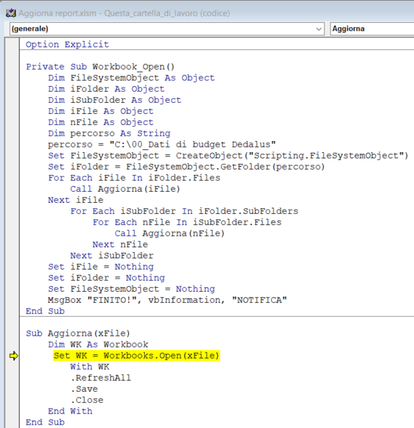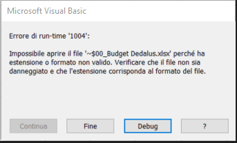 Ieri ho provato ha eliminare il file "00_Budget Dedalus.xlsx" dall'elenco e ho avviato la macro di aggiornamento....Stranamente a fine procedura mi è comparso lo stesso messaggio di errore: