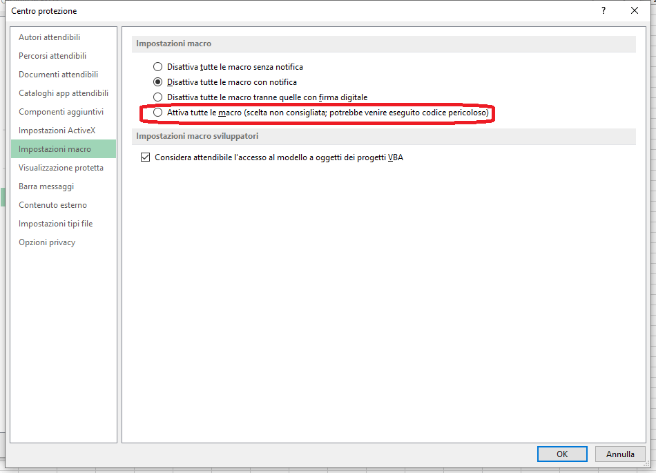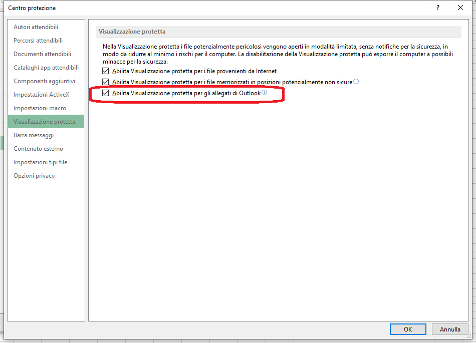 Abbiamo un problema con l'apertura di file Excel con macro da dentro outlook. Se quegli Excel li salviamo in locale e li sblocchiamo manualmente o se li salviamo in un percorso che viene considerato attendibile da Excel li apriamo correttamente, tuttavia se li apriamo da Outlook no. Da excel non lascia inserire la cartella in cui sono presenti le mail di Outlook come percorso attendibile per motivi di sicurezza, se inseriamo la cartella parent e indichiamo "includi sottocartelle" non cambia nulla. Abbiamo verificato e dato tutti i vari permessi del caso ad Excel ma il problema persiste. Abbiamo necessità di aprire dei file Excel con macro direttamente da Outlook, è possibile farlo?