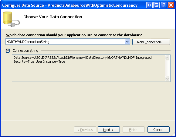 Per iniziare, aprire la OptimisticConcurrency.aspx pagina dalla SqlDataSource cartella . Trascinare un controllo SqlDataSource dalla casella degli strumenti nella finestra di progettazione, impostare la relativa ID proprietà su ProductsDataSourceWithOptimisticConcurrency. Fare quindi clic sul collegamento Configura origine dati dallo smart tag del controllo. Nella prima schermata della procedura guidata, scegli di lavorare con il NORTHWINDConnectionString e fai clic su Avanti.