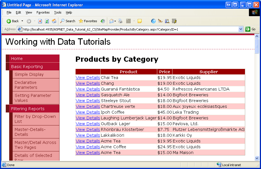 È possibile usare altri elementi dell'interfaccia utente di navigazione oltre a SiteMapPath, ad esempio i controlli Menu e TreeView. Le Default.aspxpagine , ProductsByCategory.aspxe ProductDetails.aspx nel download per questa esercitazione, ad esempio, includono tutti i controlli Menu (vedere la figura 20). Per informazioni più approfondite sui controlli di spostamento e sul sistema mappa del sito in ASP.NET 2.0, vedere ASP.NET 2.0 Sofisticate funzionalità di spostamento del sito e la sezione Uso dei controlli di spostamento e dei controlli della mappa del sito di ASP.NET 2.0.