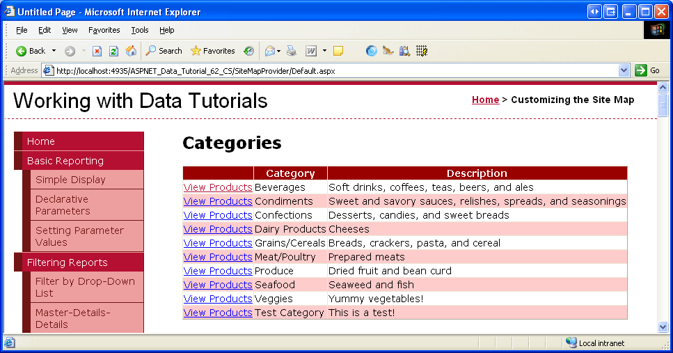Assicurarsi di testare la funzionalità di dipendenza della cache SQL. Dopo aver visitato le Default.aspxpagine , ProductsByCategory.aspxe ProductDetails.aspx , passare a una delle esercitazioni nella sezione Modifica, inserimento ed eliminazione e modificare il nome di una categoria o di un prodotto. Tornare quindi a una delle pagine nella SiteMapProvider cartella . Supponendo che sia trascorso un tempo sufficiente per il meccanismo di polling per prendere nota della modifica al database sottostante, la mappa del sito deve essere aggiornata per visualizzare il nuovo nome di prodotto o categoria.