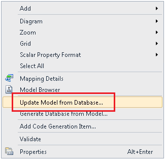 Nella cartella DAL aprire il file SchoolModel.edmx , fare clic con il pulsante destro del mouse sull'area di progettazione e scegliere Aggiorna modello dal database.