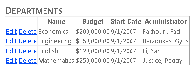 Le pagine create in questa esercitazione funzionano con il Departments set di entità del modello di dati creato nella serie di esercitazioni di Introduzione.
