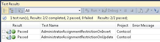 In Contoso University qualsiasi insegnante singolo può essere solo l'amministratore di un singolo reparto ed è necessario aggiungere la logica di business per applicare questa regola. Si inizierà aggiungendo test ed eseguendo i test per verificarne l'esito negativo. Si aggiungerà quindi il codice ed eseguirà di nuovo i test, prevedendo che vengano superati.