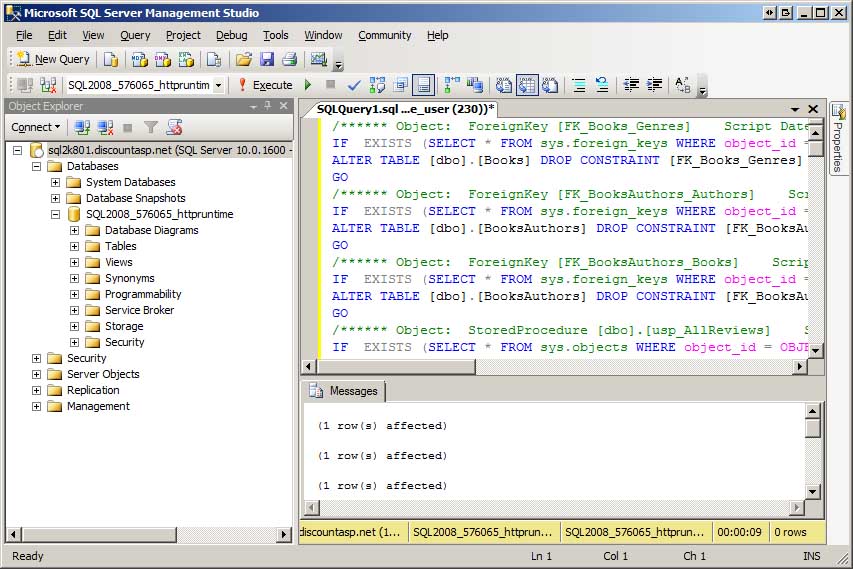 Ora che è disponibile lo script che contiene i comandi SQL per creare il database e i relativi dati, tutto ciò che rimane consiste nell'eseguire lo script nel database di produzione. Alcuni provider di host Web offrono una casella di testo nella relativa Pannello di controllo in cui è possibile immettere i comandi SQL da eseguire nel database. Se si dispone di un file di script di dimensioni molto grandi, questa opzione potrebbe non funzionare (il REVIEWS.MDF.sql file di script è di dimensioni superiori a 425 KB, ad esempio).