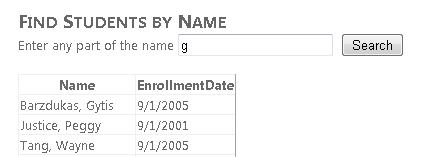 Eseguire la pagina. Inizialmente vengono visualizzati tutti gli studenti perché il valore predefinito per il StudentName parametro è "%".