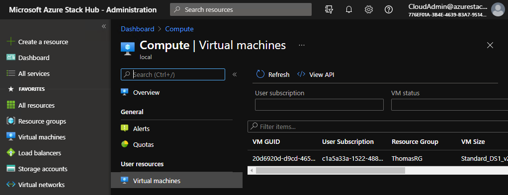 A partire dalla versione 2301 dell'hub di Azure Stack, è stata aggiunta una nuova visualizzazione per gli operatori nel portale di amministrazione dell'hub di Azure Stack che mostra le macchine virtuali in tutte le sottoscrizioni utente. Questa visualizzazione visualizza le informazioni seguenti: