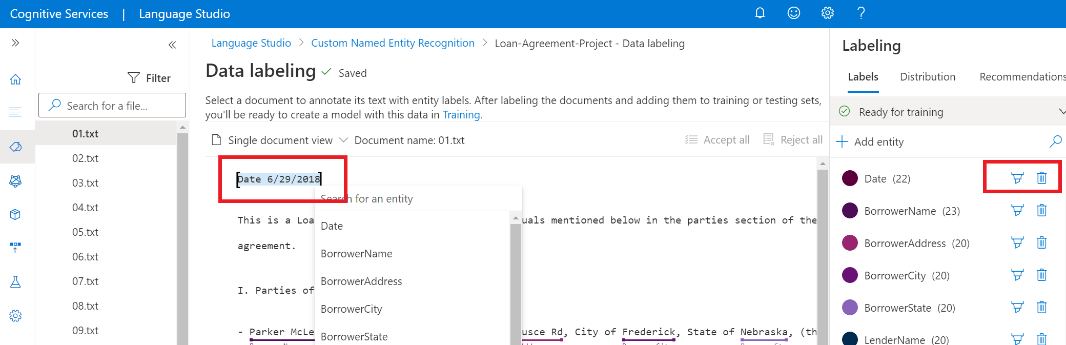 Prima di eseguire il training del modello, è necessario etichettare i documenti con le entità personalizzate da estrarre. L'etichettatura dei dati è un passaggio fondamentale del ciclo di vita dello sviluppo. È possibile creare i tipi di entità da estrarre dai dati ed etichettare queste entità all'interno dei documenti. Questi dati vengono usati nel passaggio successivo durante il training del modello in modo che il modello possa apprendere dai dati etichettati. Se i dati sono già etichettati, è possibile importarli direttamente nel progetto, ma è necessario assicurarsi che i dati seguano il formato di dati accettato. Per altre informazioni sull'importazione di dati etichettati nel progetto, vedere creare un progetto.