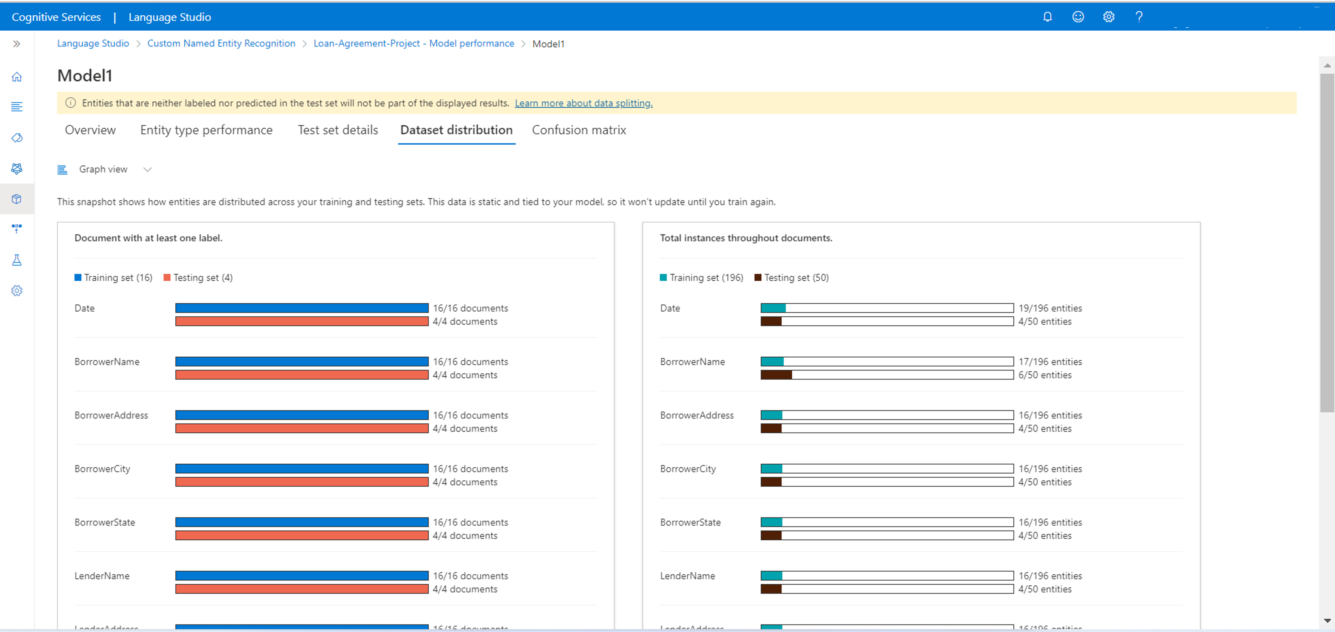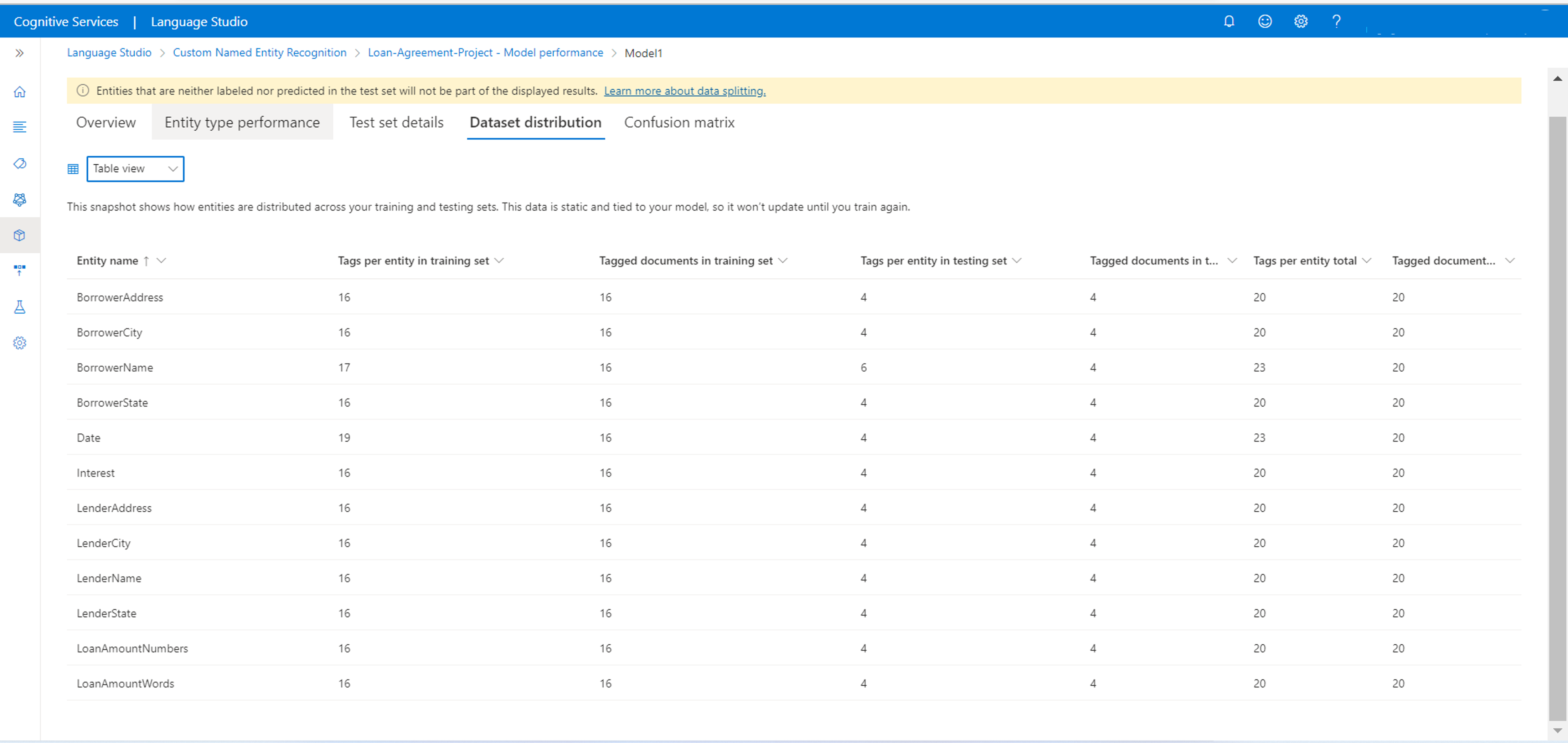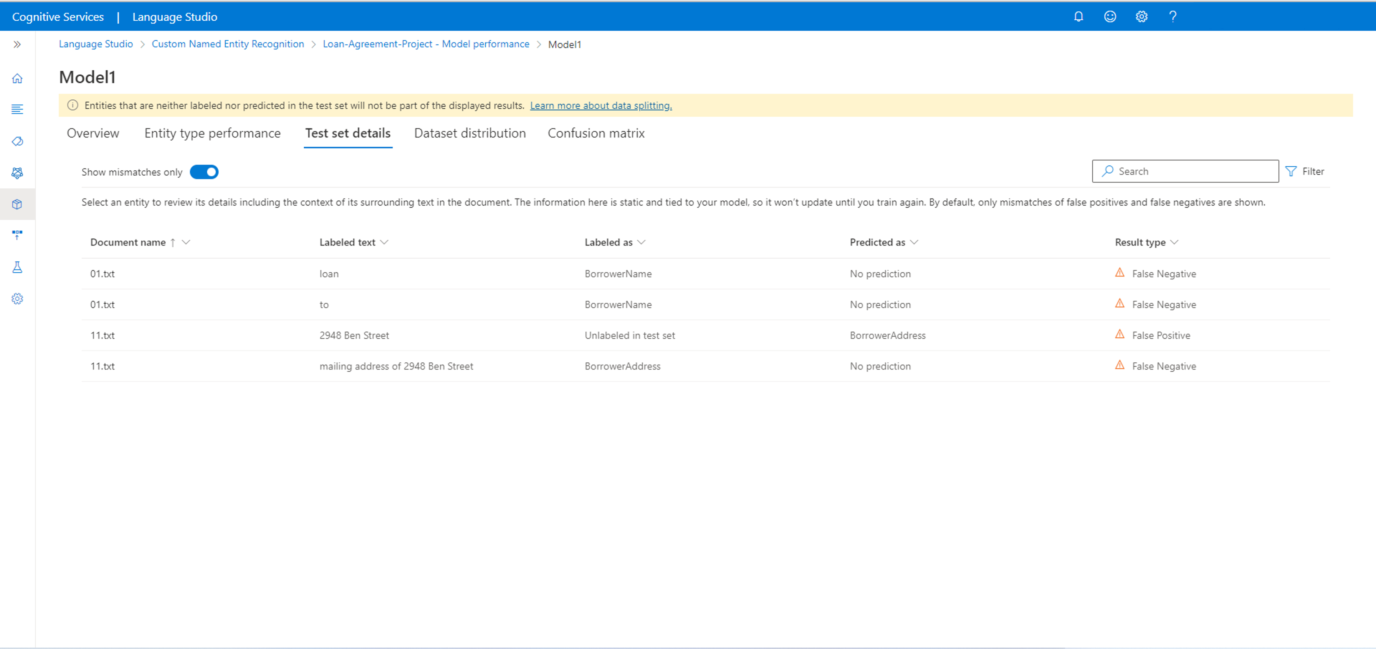 È anche possibile visualizzare indicazioni su come migliorare il modello. Quando si seleziona visualizzano i dettagli, viene aperto un pannello laterale per fornire altre indicazioni su come migliorare il modello. In questo esempio, le entità BorrowerAddress e BorrowerNamevengono confuse con l'entità $none. Selezionando le entità confuse, si passa alla pagina di etichettatura dei dati per etichettare più dati con l'entità corretta.