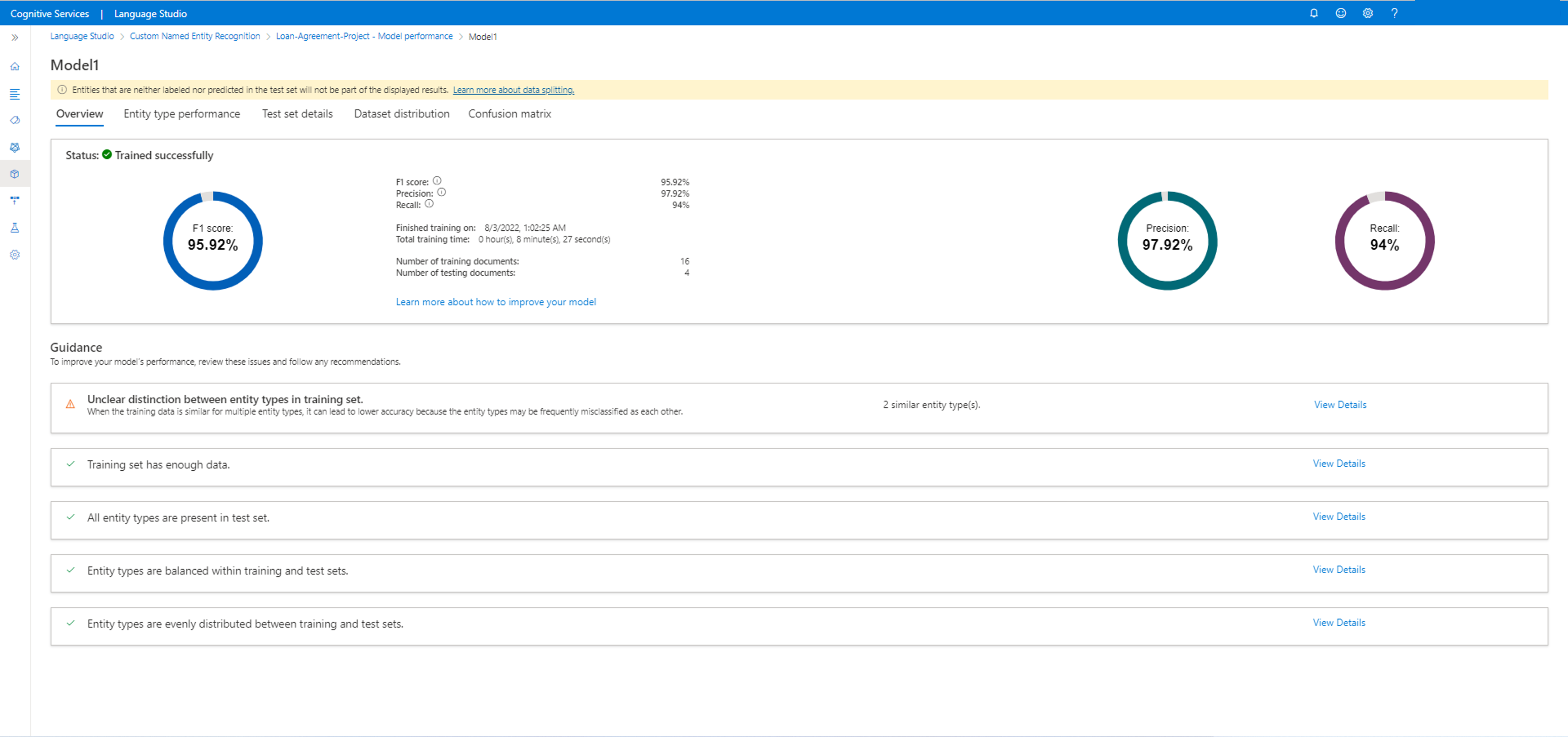 In questa scheda è possibile visualizzare i dettagli del modello, ad esempio: punteggio F1, precisione, richiamo, data e ora per il processo di training, tempo totale di training e numero di documenti di training e test inclusi in questo processo di training.