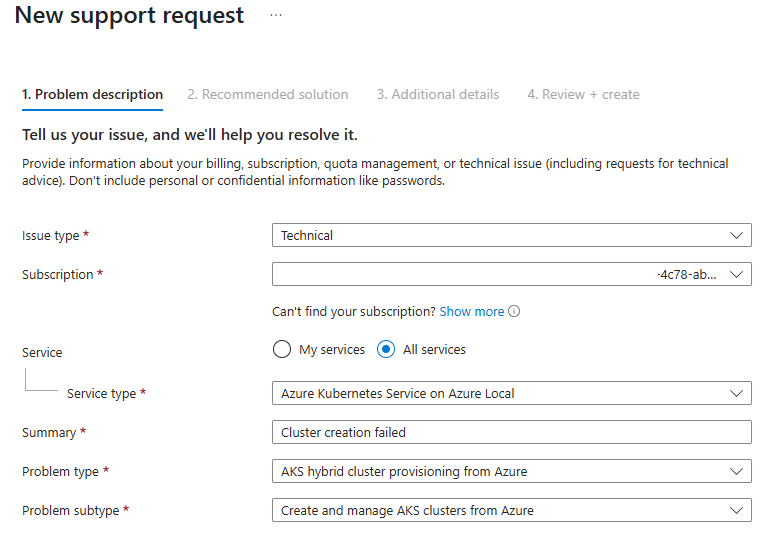 Se si verifica un problema con AKS su Azure Local, questo articolo descrive come aprire una richiesta di supporto.