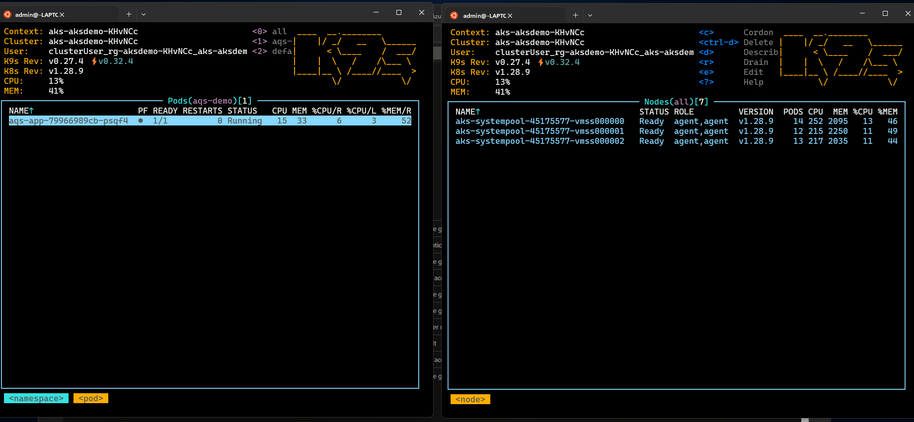 AQS_TARGET_NAMESPACE(il valore predefinito èaqs-demo) e avviare k9s in ogni finestra.Viene visualizzata una schermata simile a quanto riportato di seguito: