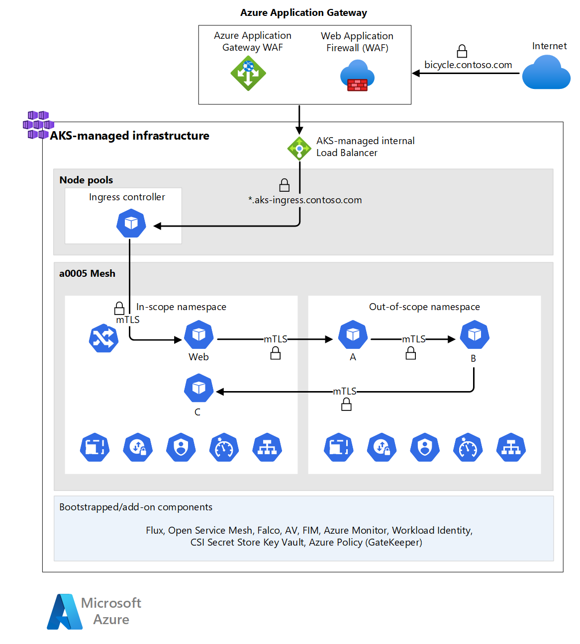 La progettazione deve avere una catena strategica di punti di terminazione TLS. Man mano che i dati passano attraverso hop di rete, mantenere TLS a hop che richiedono l'ispezione dei pacchetti. Almeno, avere il punto di terminazione TLS finale nella risorsa di ingresso del cluster. Prendere in considerazione l'ulteriore approfondimento all'interno delle risorse del cluster.
