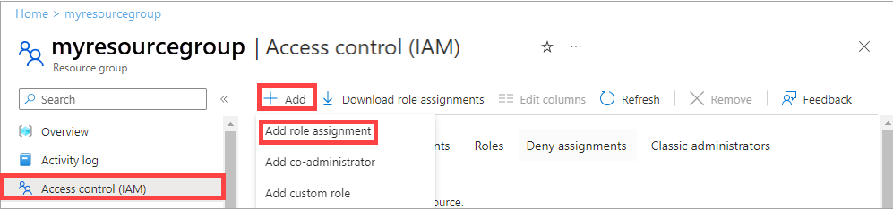 Nel portale di Azure, passare al gruppo di risorse utilizzato per registrare le macchine della tua sottoscrizione. Nel riquadro sinistro selezionare Controllo di accesso (IAM). Nel riquadro destro selezionare + Aggiungi e nell'elenco a discesa selezionare Aggiungi assegnazione di ruolo.
