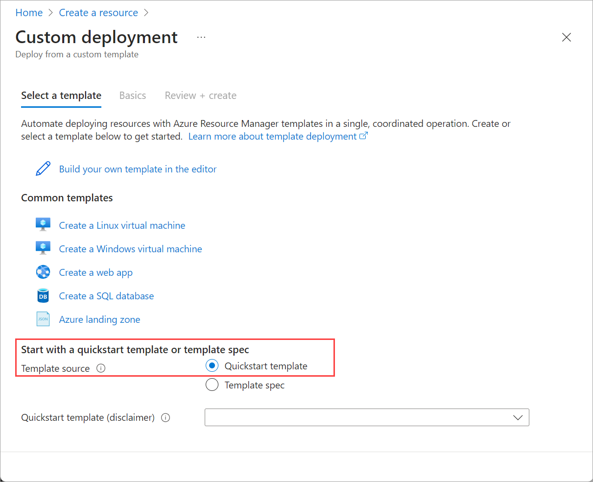 Nella parte inferiore della pagina trovare la sezione Iniziare con un modello di avvio rapido o una specifica di modello . Selezionare l'opzione Modello di avvio rapido .