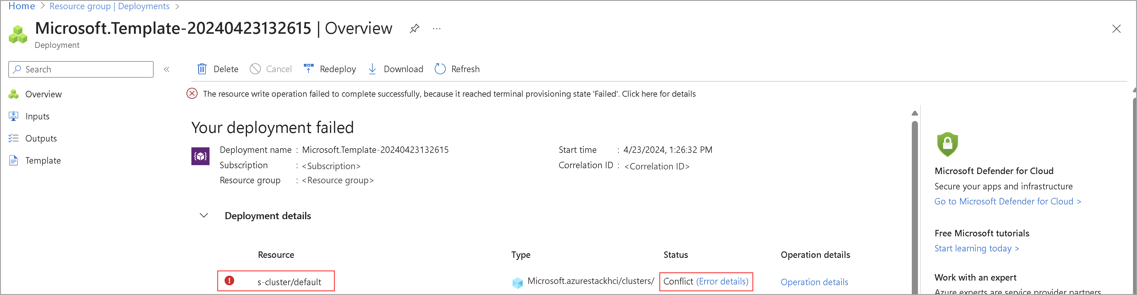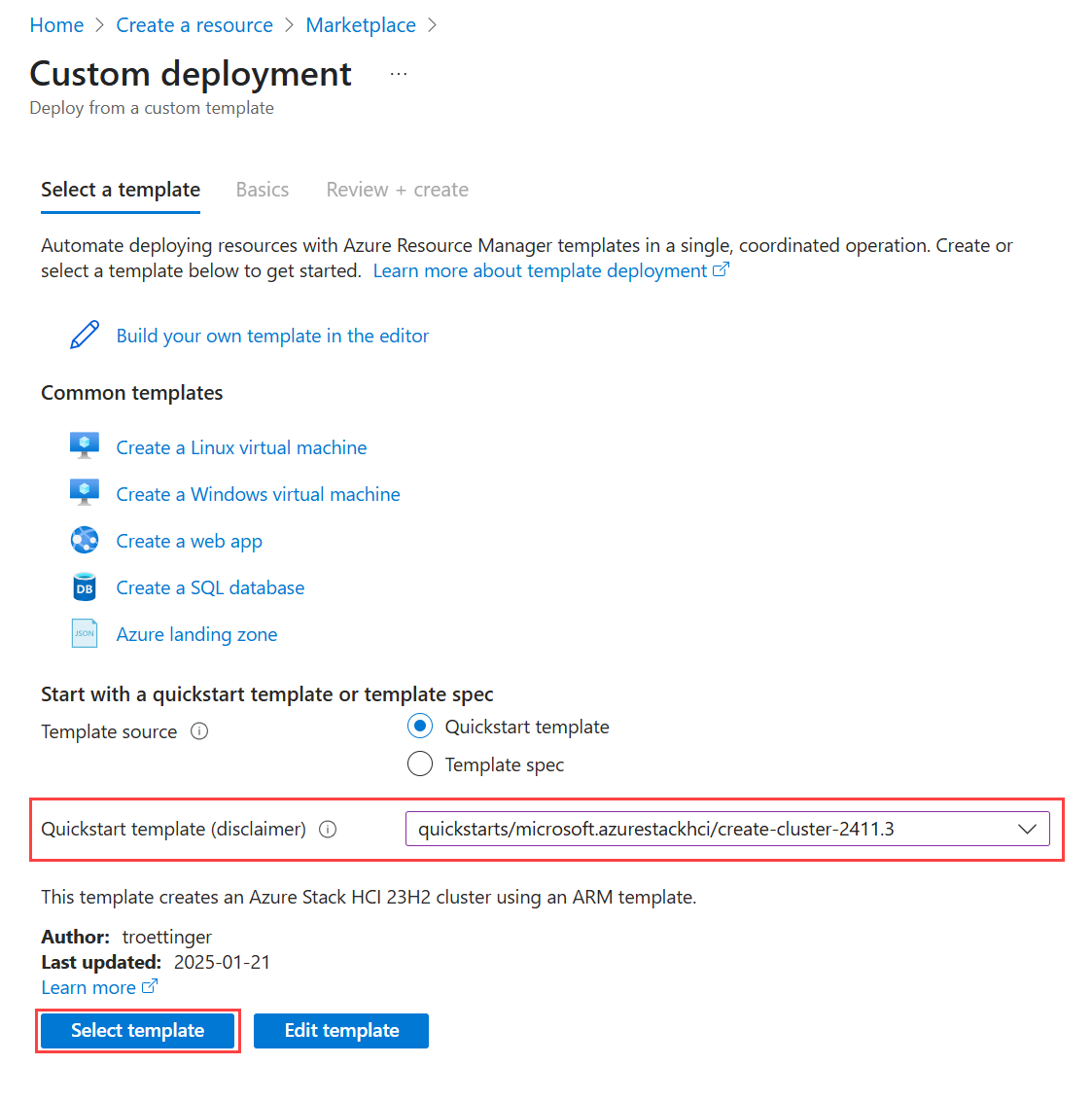 - Per Azure Local 2411.3 e versioni precedenti, assicurarsi di selezionare il modello create-cluster-2411.3 per la distribuzione.