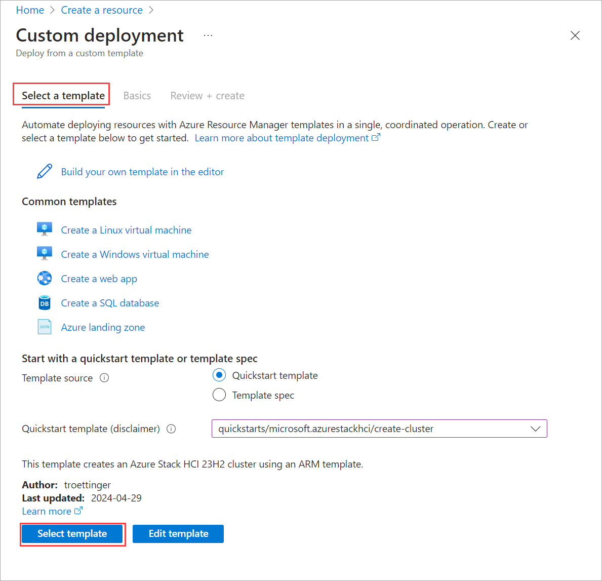 Usare il campo Modello di avvio rapido (dichiarazione di non responsabilità) per filtrare il modello appropriato. Digitare azurestackhci/create-cluster per il filtro.