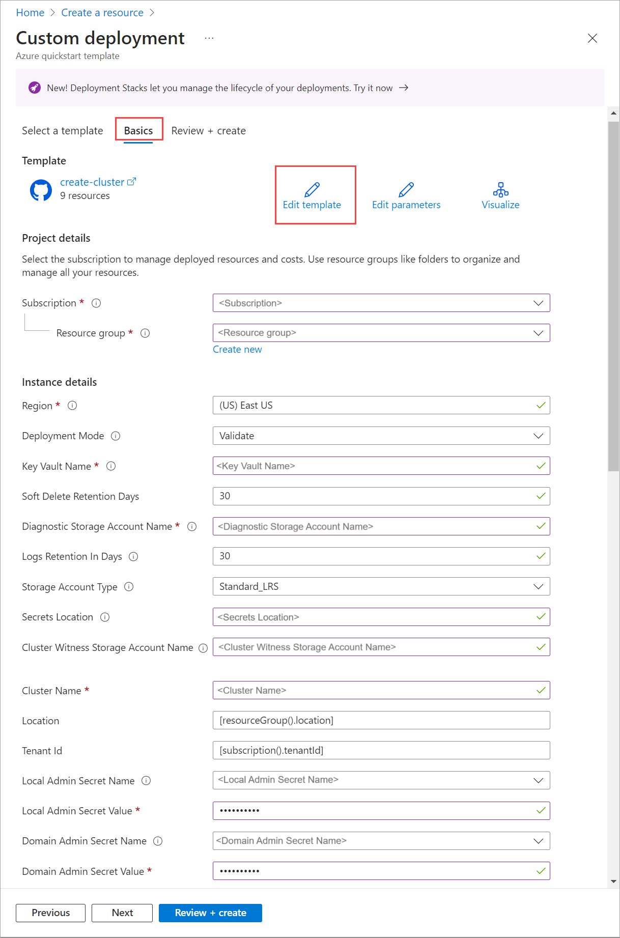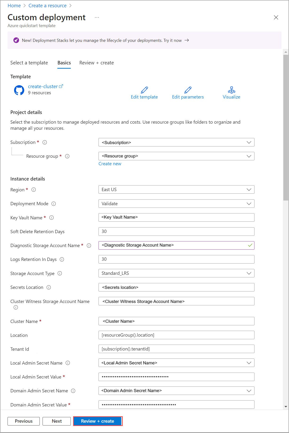 Dopo aver completato tutti i passaggi di preparazione e prerequisiti, è possibile eseguire la distribuzione usando un modello di distribuzione ARM valido e testato e il file JSON dei parametri corrispondente. Usare i parametri contenuti nel file JSON per compilare tutti i valori, inclusi i valori generati in precedenza.