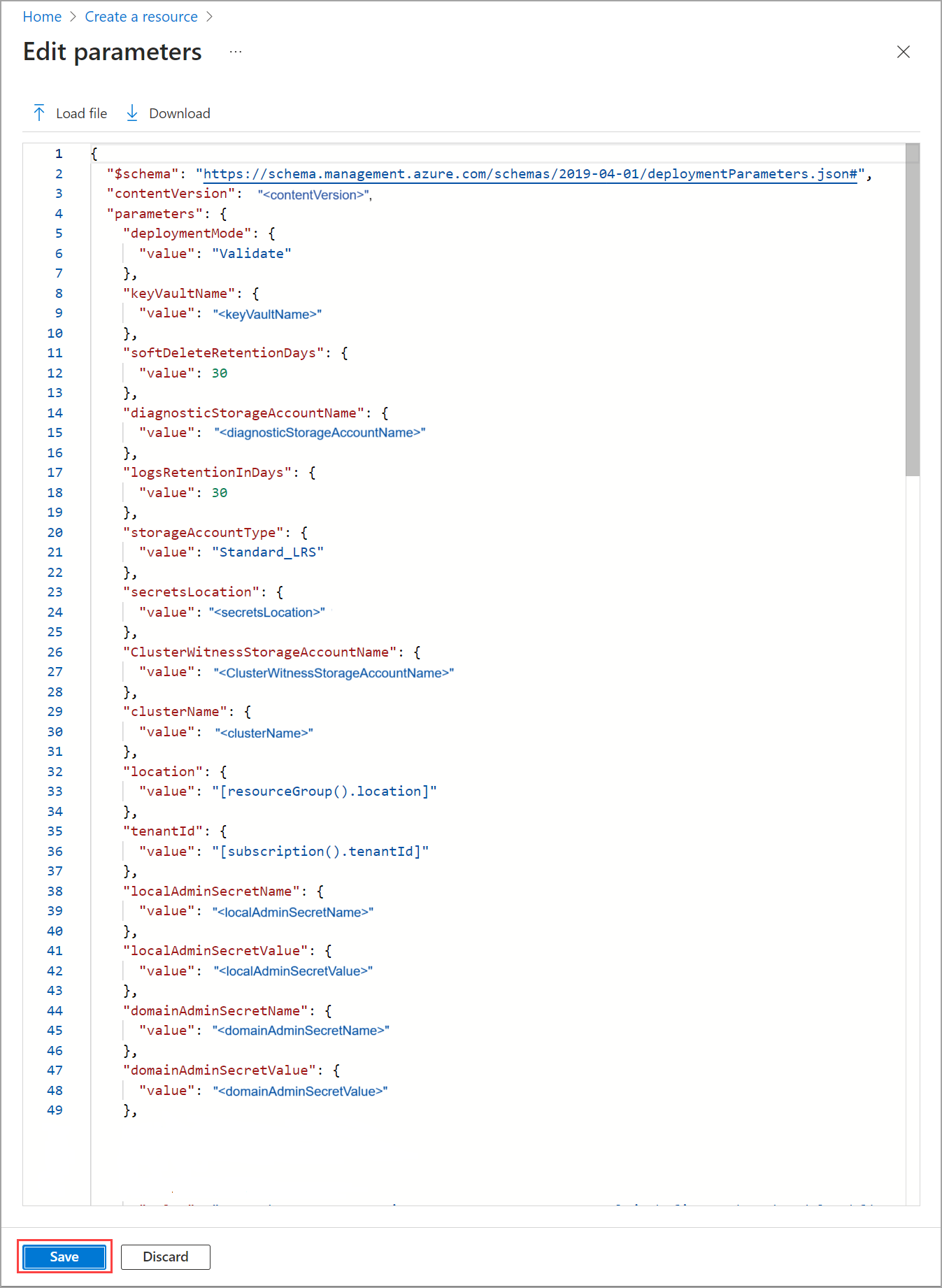 Assicurarsi che tutti i parametri nel file JSON siano compilati, inclusi i segnaposto visualizzati come [“”], che indicano che il parametro prevede una struttura di matrice. Sostituire questi valori con valori effettivi in base all'ambiente di distribuzione o la convalida avrà esito negativo.