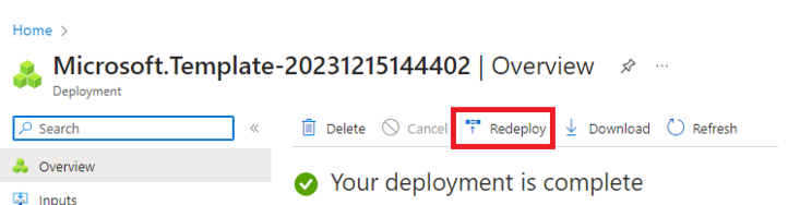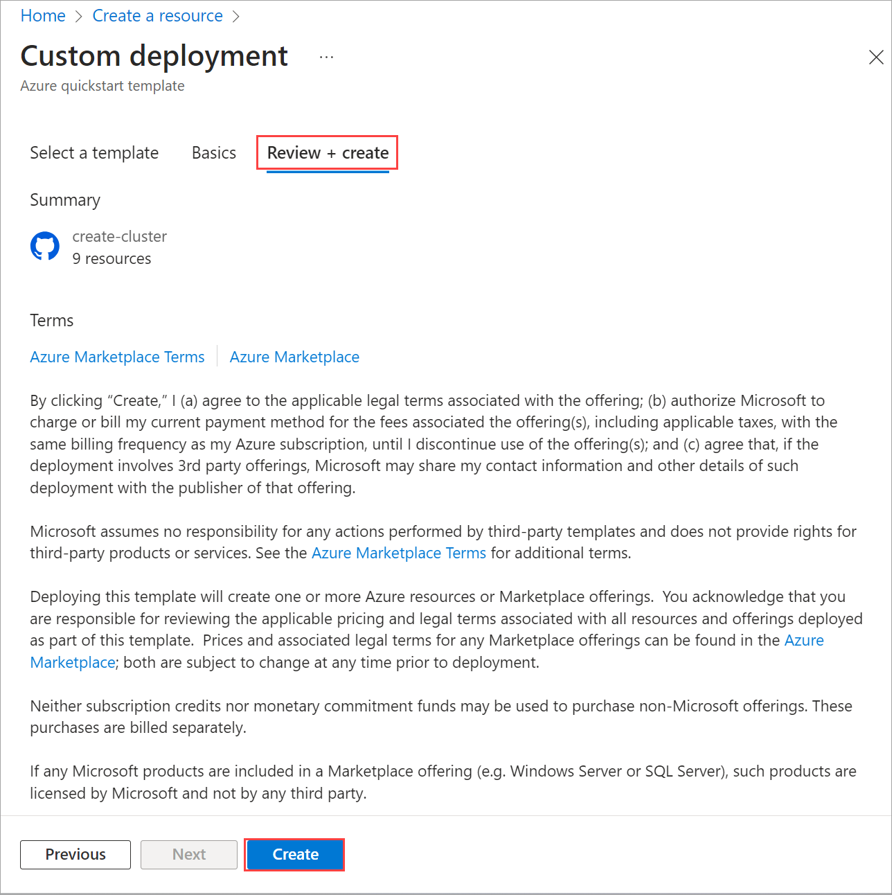 Selezionare Crea. La distribuzione inizia usando le risorse dei prerequisiti esistenti create durante il passaggio Convalida .