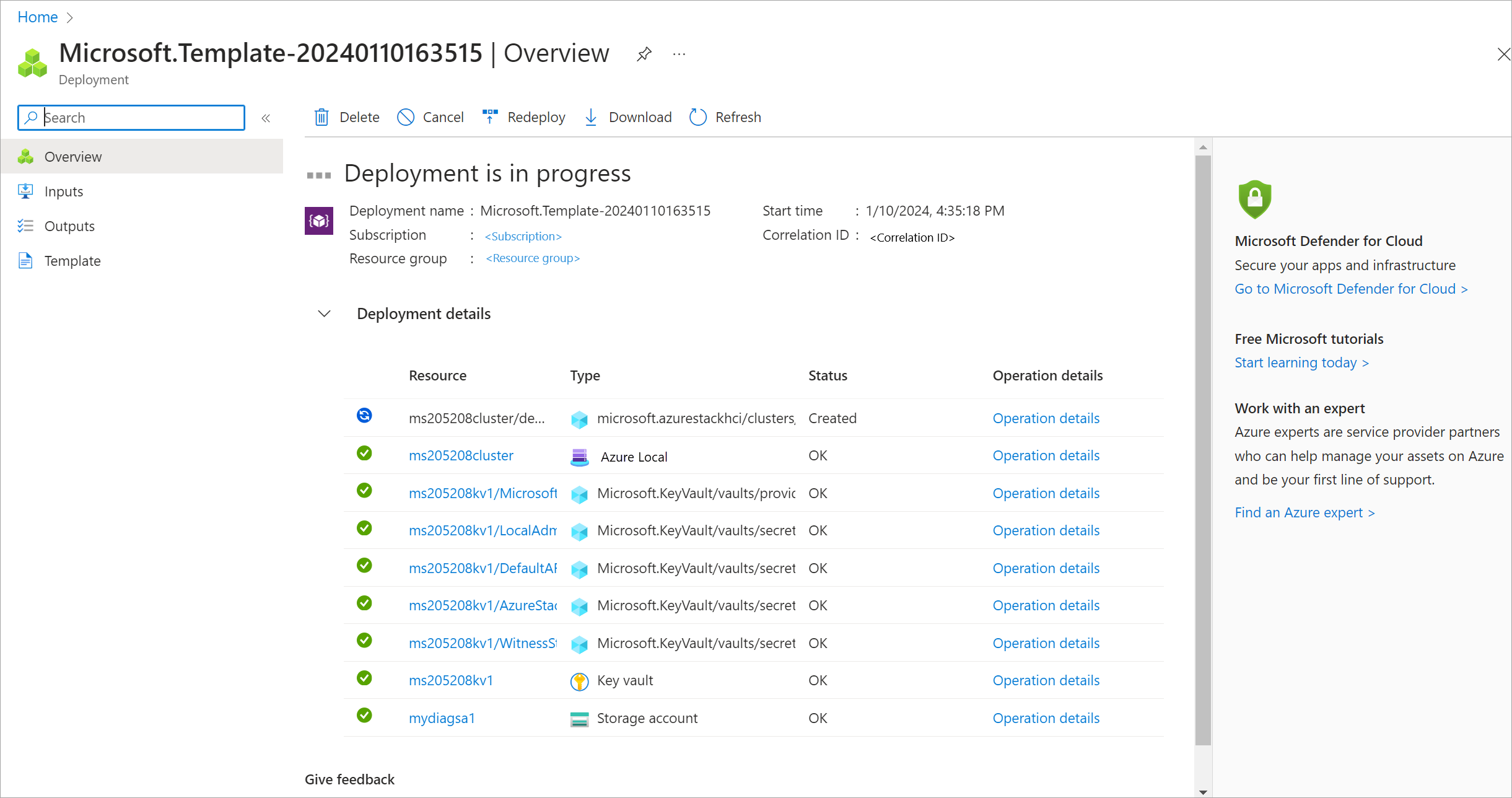 La schermata di distribuzione aggiorna la risorsa del cluster durante la distribuzione.