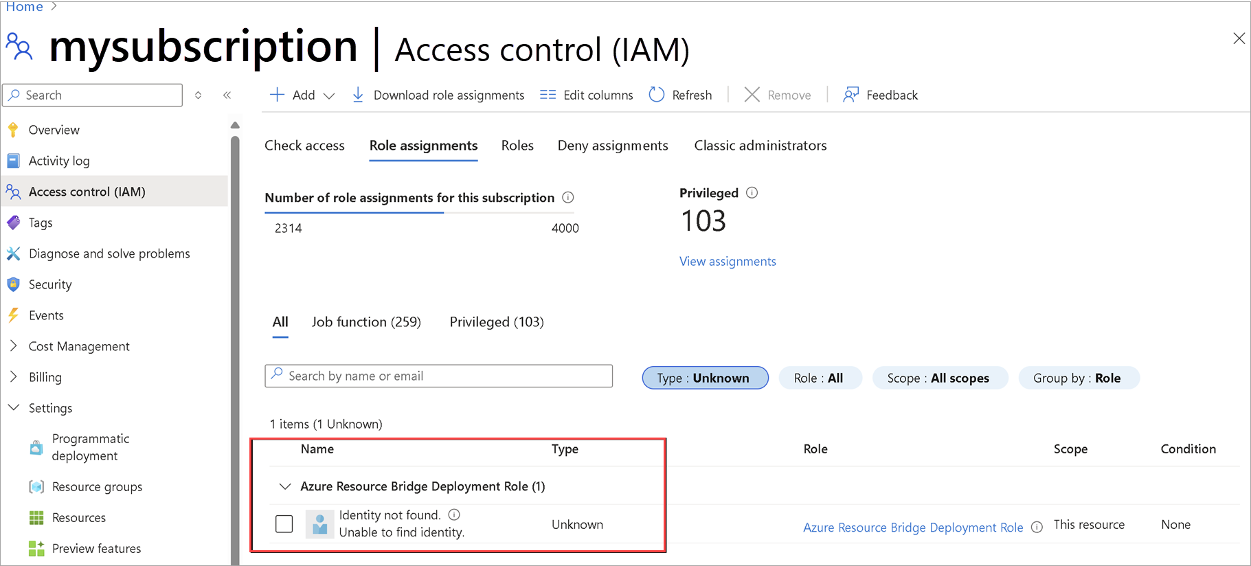Soluzione alternativa: per identificare le assegnazioni di ruolo zombie, passare alla scheda Controllo di accesso (IAM) > Assegnazioni di ruolo > Tipo: Sconosciuto. Queste assegnazioni sono elencate come Identità non trovata. Impossibile trovare l'identità. Eliminare tali assegnazioni di ruolo e quindi riprovare la distribuzione del modello ARM.