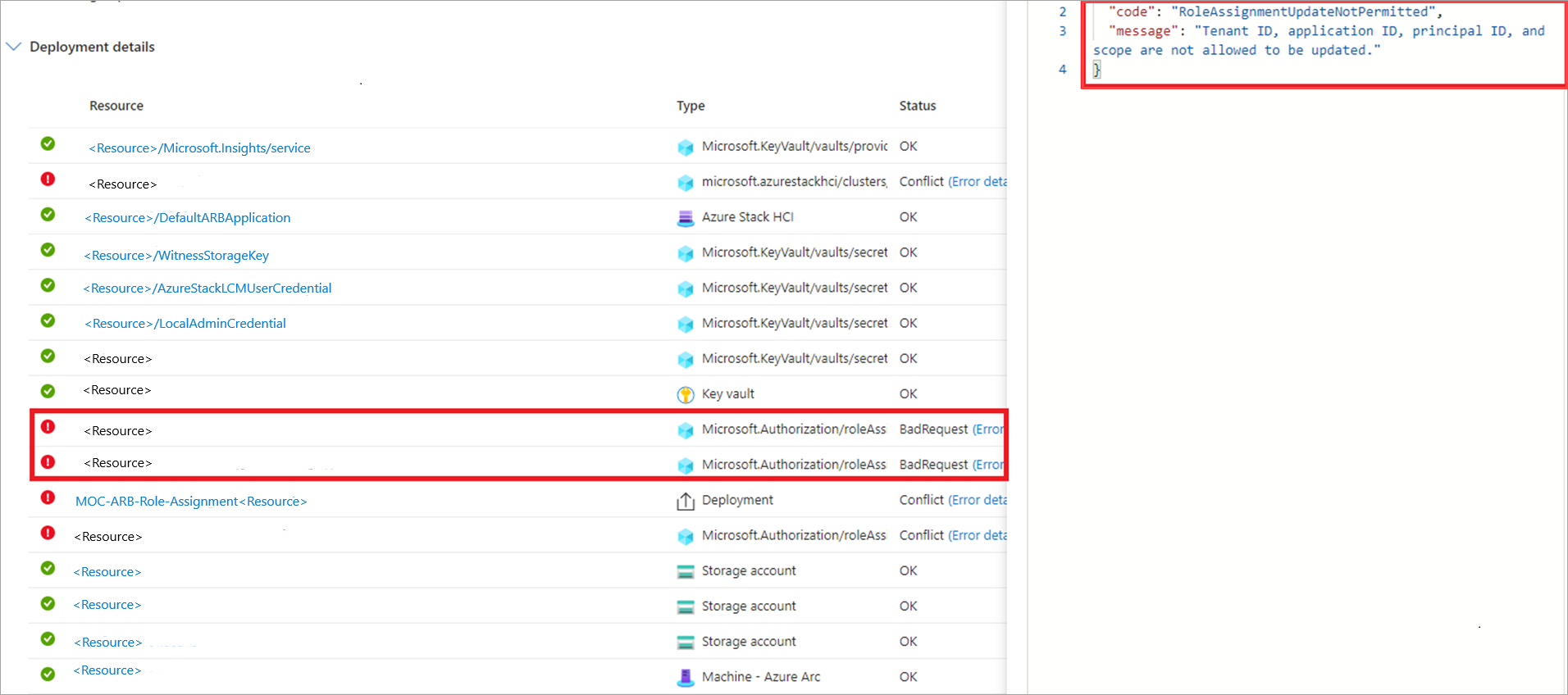 Problema: l'assegnazione di ruolo fallisce con l'errore ID tenant, ID applicazione, ID entità e ambito non possono essere aggiornati. Questo errore viene visualizzato nella pagina > per la risorsa applicabile. Questo errore può essere visualizzato quando sono presenti assegnazioni di ruolo zombie nello stesso gruppo di risorse. Ad esempio, quando è stata eseguita una distribuzione precedente e le risorse corrispondenti a tale distribuzione sono state eliminate, ma le risorse di assegnazione di ruolo sono state lasciate in giro.