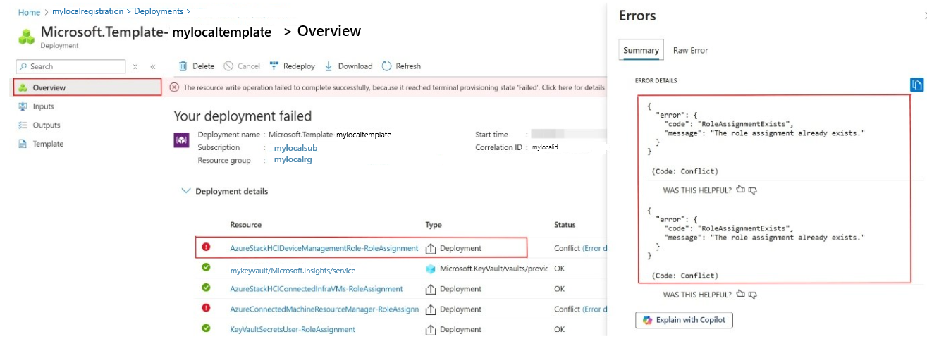 Problema: in questa versione, potresti vedere l'errore l'assegnazione di ruolo esiste già. Questo errore si verifica se si è tentato di prima distribuire l'istanza locale di Azure dal portale e poi lo stesso gruppo di risorse è stato usato per la distribuzione del modello ARM. Questo errore viene visualizzato nella pagina > per la risorsa applicabile. Questo errore indica che un'assegnazione di ruolo equivalente è già stata eseguita da un'altra identità per lo stesso ambito del gruppo di risorse e che la distribuzione del modello di Resource Manager non è in grado di eseguire l'assegnazione di ruolo.