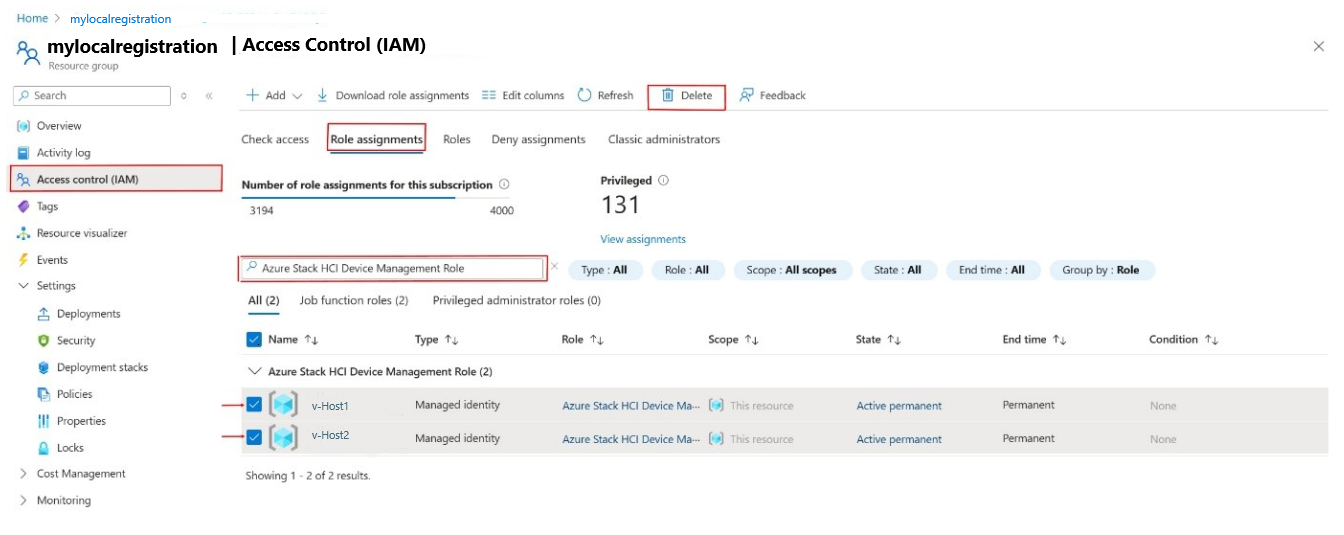 Soluzione alternativa: la risorsa non riuscita nella pagina Dettagli distribuzione specifica il nome dell'assegnazione di ruolo. Se il nome della risorsa è AzureStackHCIDeviceManagementRole-RoleAssignment , l'assegnazione di ruolo non è riuscita per il ruolo di gestione dei dispositivi di Azure Stack HCI. Prendere nota di questo ruolo e passare a >. Cercare il nome corrispondente ed eliminare le assegnazioni di ruolo esistenti. Ridistribuisci il tuo modello.