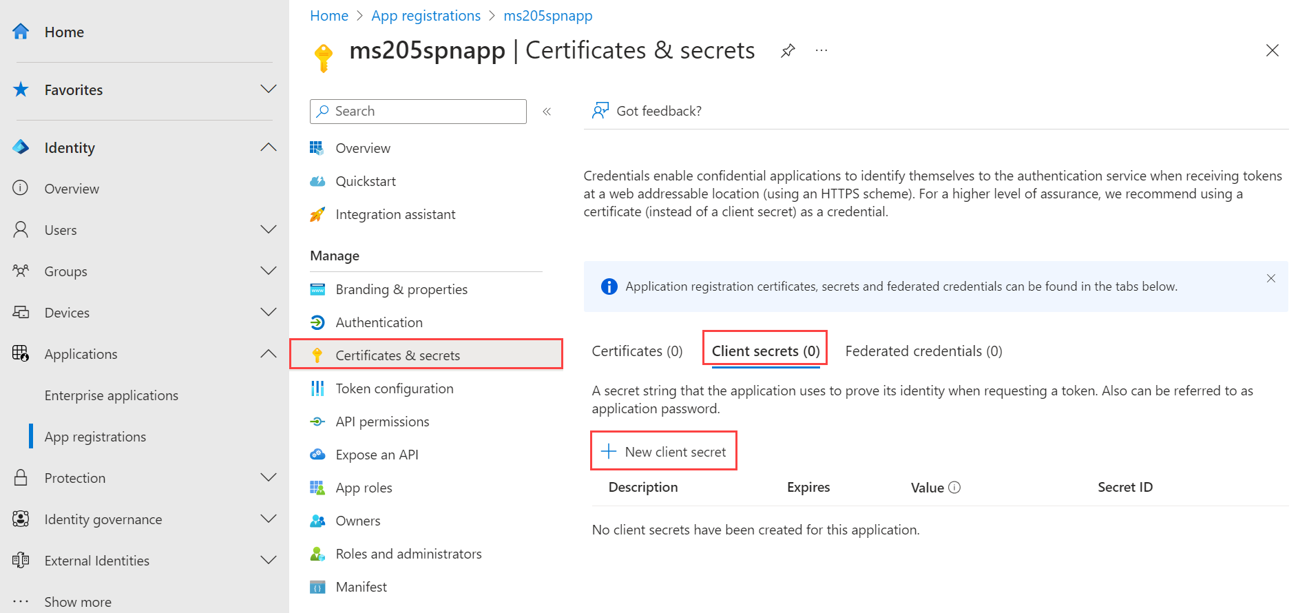 Passare alla registrazione dell'applicazione creata e passare a > Segreti client.