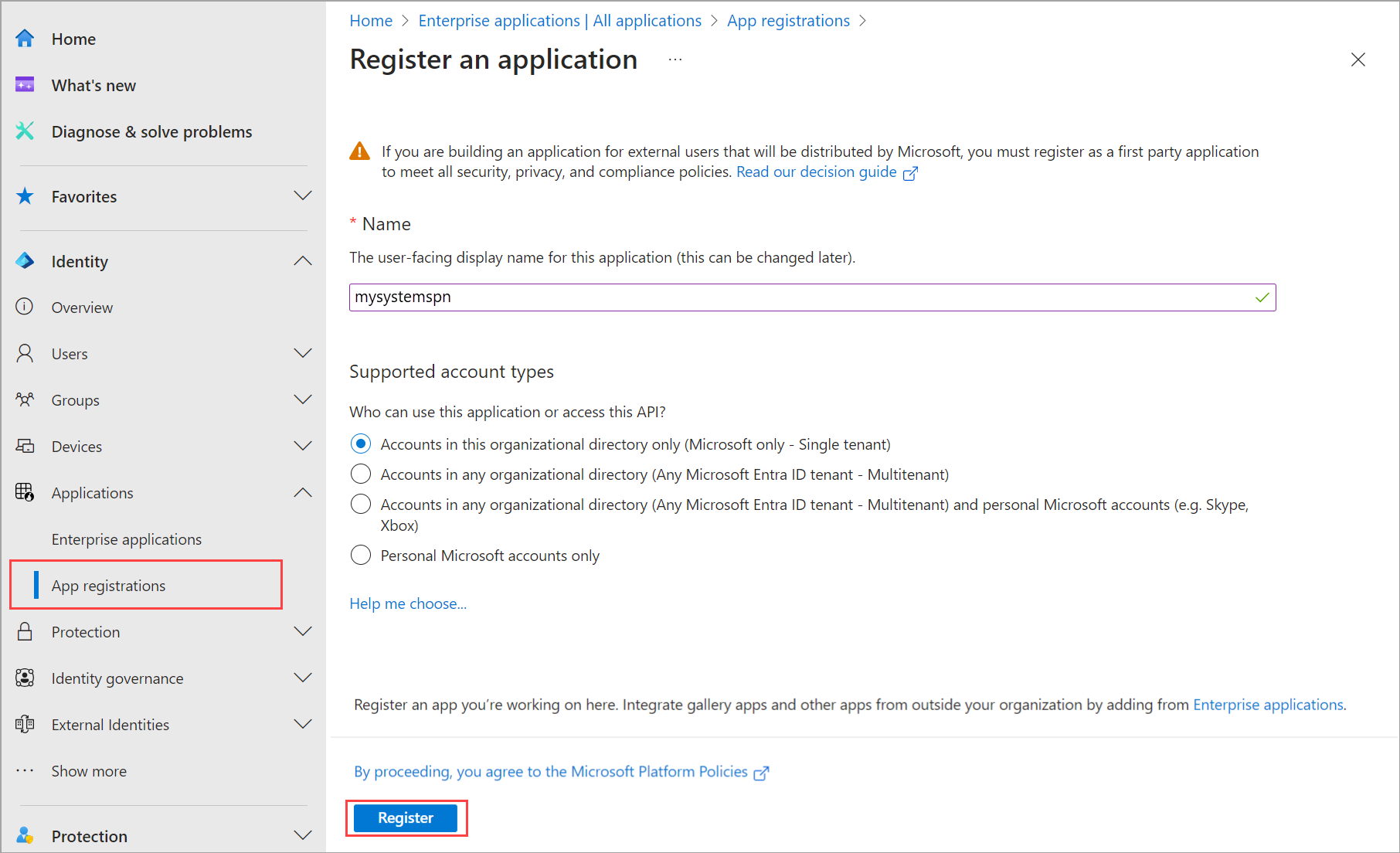 Specificare un nome per l'applicazione, selezionare un tipo di account supportato e quindi selezionare Registra.