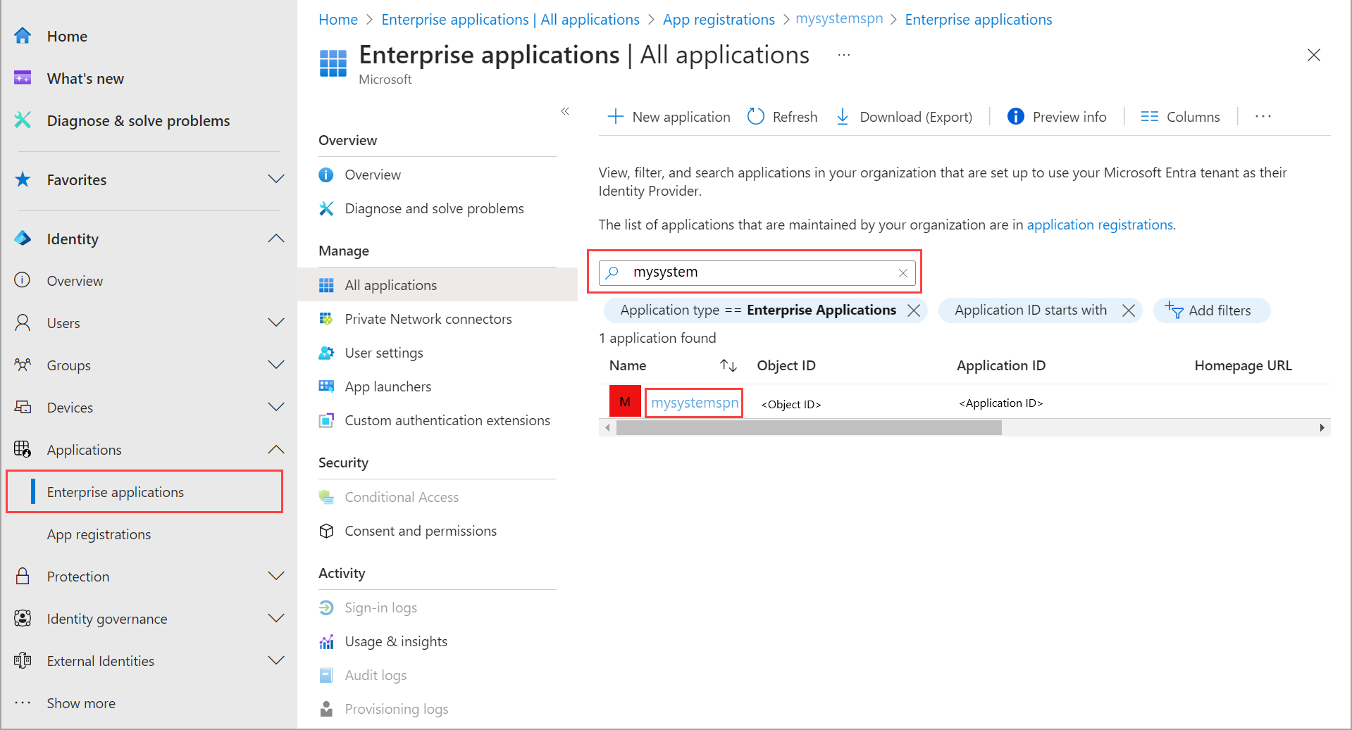 Dopo aver creato il principale del servizio, passare alla pagina delle applicazioni aziendali. Cerca e seleziona l'SPN che hai creato.