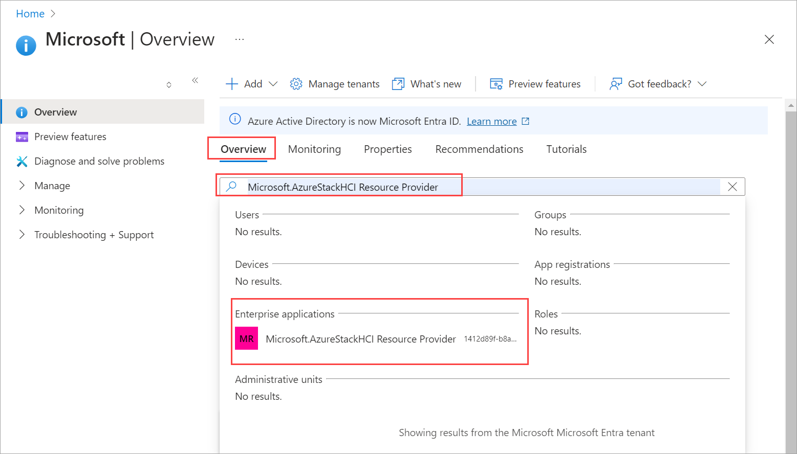 Passare alla scheda Panoramica e cercare Microsoft.AzureStackHCI Resource Provider.