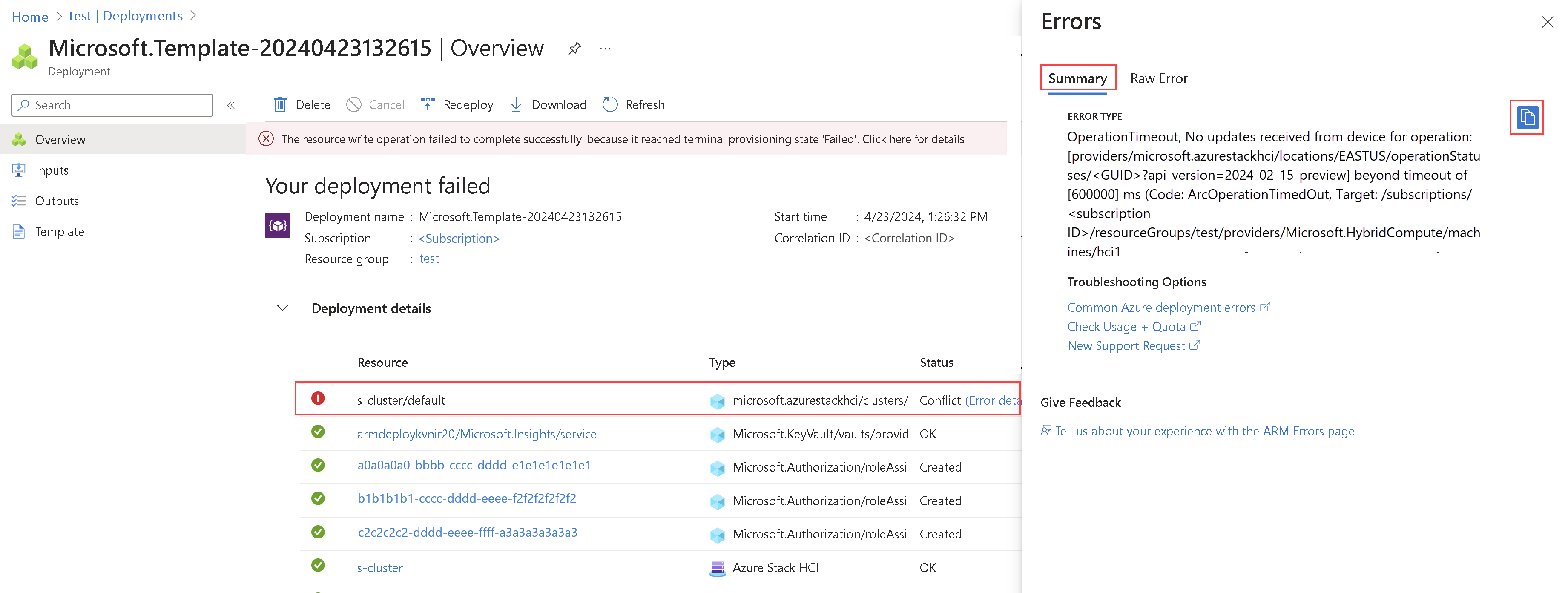 Problema: in questa versione, potresti vedere l'errore l'assegnazione di ruolo esiste già. Questo errore si verifica se si è tentato di prima distribuire l'istanza locale di Azure dal portale e poi lo stesso gruppo di risorse è stato usato per la distribuzione del modello ARM. Questo errore viene visualizzato nella pagina > per la risorsa applicabile. Questo errore indica che un'assegnazione di ruolo equivalente è già stata eseguita da un'altra identità per lo stesso ambito del gruppo di risorse e che la distribuzione del modello di Resource Manager non è in grado di eseguire l'assegnazione di ruolo.