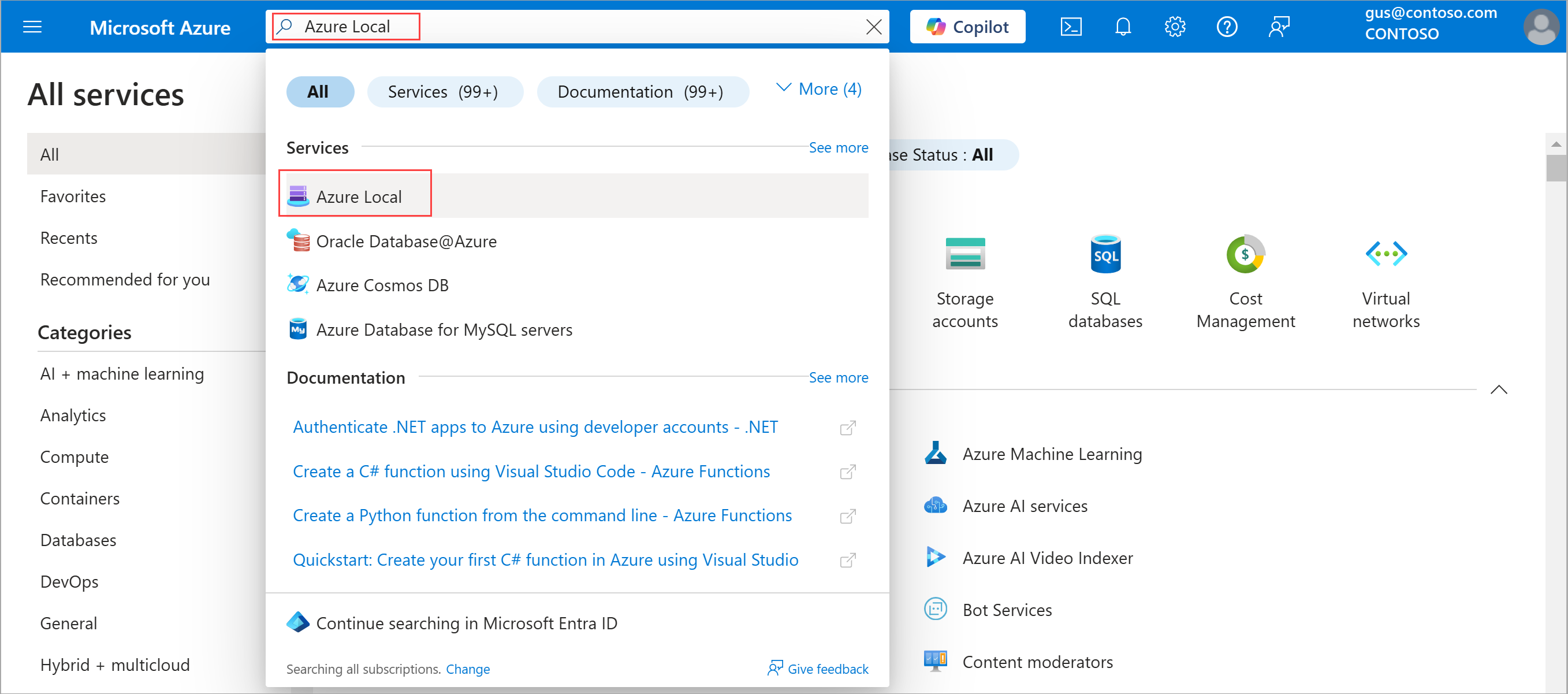 Nella barra di ricerca del portale di Azure nella parte superiore immettere Azure Local. Durante la digitazione, il portale inizia a suggerire risorse e servizi correlati in base all'input. Selezionare Locale di Azure nella categoria Servizi .
