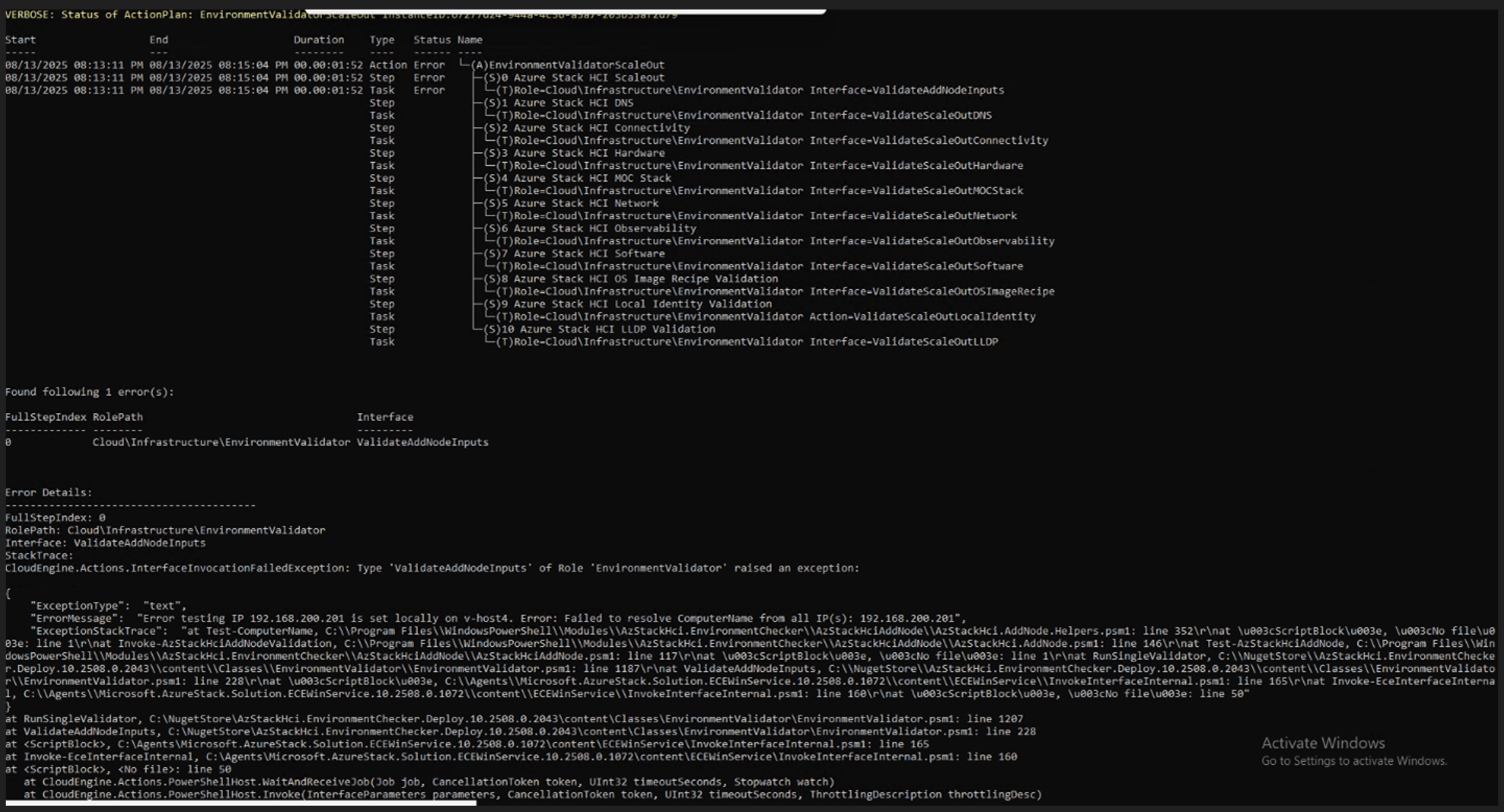 A partire dalla versione 2508, la convalida viene eseguita dopo l'esecuzione del Add-Server comando. Se un test non riesce, il validator restituisce informazioni utili per risolvere l'errore.