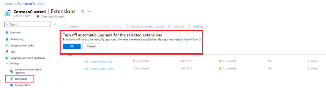 È possibile disabilitare gli aggiornamenti automatici per determinate estensioni nel portale di Azure. Per disabilitare gli aggiornamenti automatici, passare alla pagina Estensioni ed eseguire questa procedura: