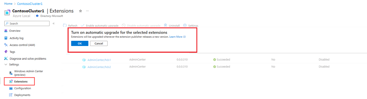 L'aggiornamento manuale dell'estensione funziona come l'aggiornamento automatico dell'estensione. In un cluster abilitato per Azure Local Arc, quando si aggiorna manualmente un'estensione, Azure salva la versione selezionata. Azure tenta quindi di aggiornare l'estensione in tutti i nodi del cluster a tale versione. Assicurarsi che le estensioni siano supportate per l'aggiornamento manuale.