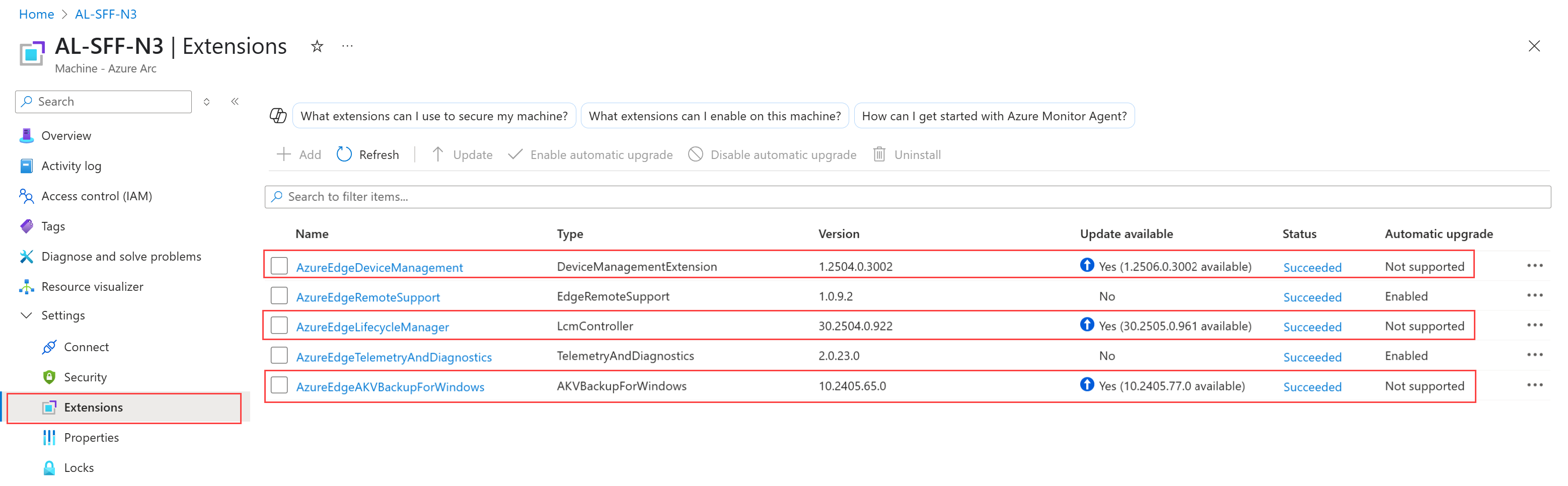 L'aggiornamento manuale delle estensioni di Azure Arc dalla pagina Computer locale di Azure tramite il portale di Azure potrebbe causare problemi durante la distribuzione. Le estensioni che non devono essere aggiornate manualmente sono: AzureEdgeDeviceManagement, AzureEdgeLifecycleManagere AzureEdgeAKVBackupForWindows come illustrato nella figura.