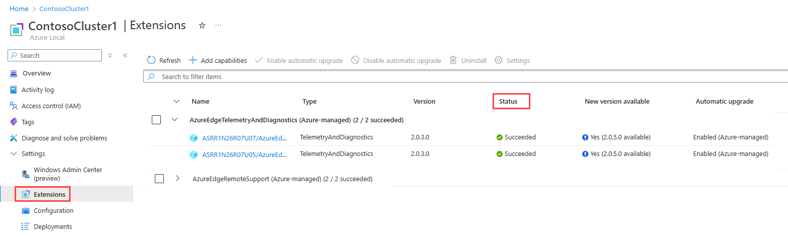 Dopo aver registrato correttamente la nuova istanza locale di Azure con Azure, le estensioni gestite da Azure vengono installate automaticamente nel sistema. Queste estensioni sono essenziali per le funzionalità e la qualità del sistema e non è possibile disinstallarle. È possibile gestire il comportamento delle estensioni nel portale di Azure nella pagina Estensioni selezionando il menu Impostazioni .