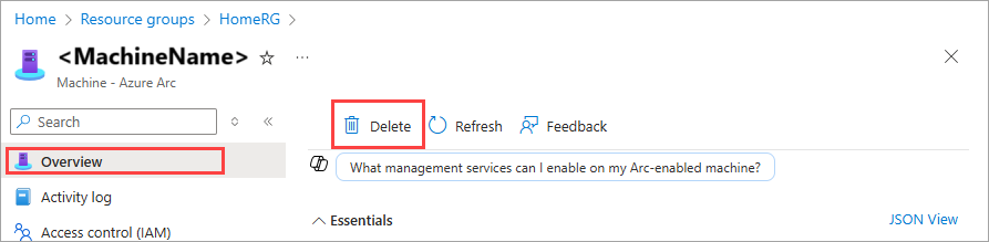 Nella pagina Panoramica della risorsa computer Azure Arc selezionare Elimina nel riquadro destro. Questa azione deve eliminare il nodo del computer difettoso.